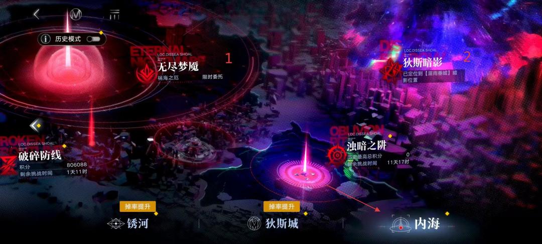 无尽梦魇:可自选难度且通过多次探索获得界石点亮梦魇界碑获得增益使得此模式更简单。在看到旧日铭鉴主题奖励为限时奖励,积分奖励没有时间限制(随着主题活动更换奖励也会新增)。