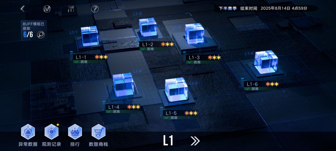 数据间隙:分为L1和L2,L1分为6个小关卡,L2分为3个大关卡。本期L1有难有简单关卡达成对应条件获取星星数量,L2想获取高分需要有一定角色池深度和角色练度。