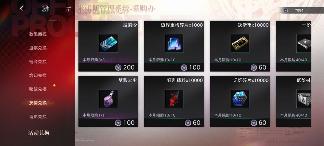 解锁以前活动需要道具可以在采购办购买,完成一个活动所有内容后提升1000弥合阈值可获得100异方晶