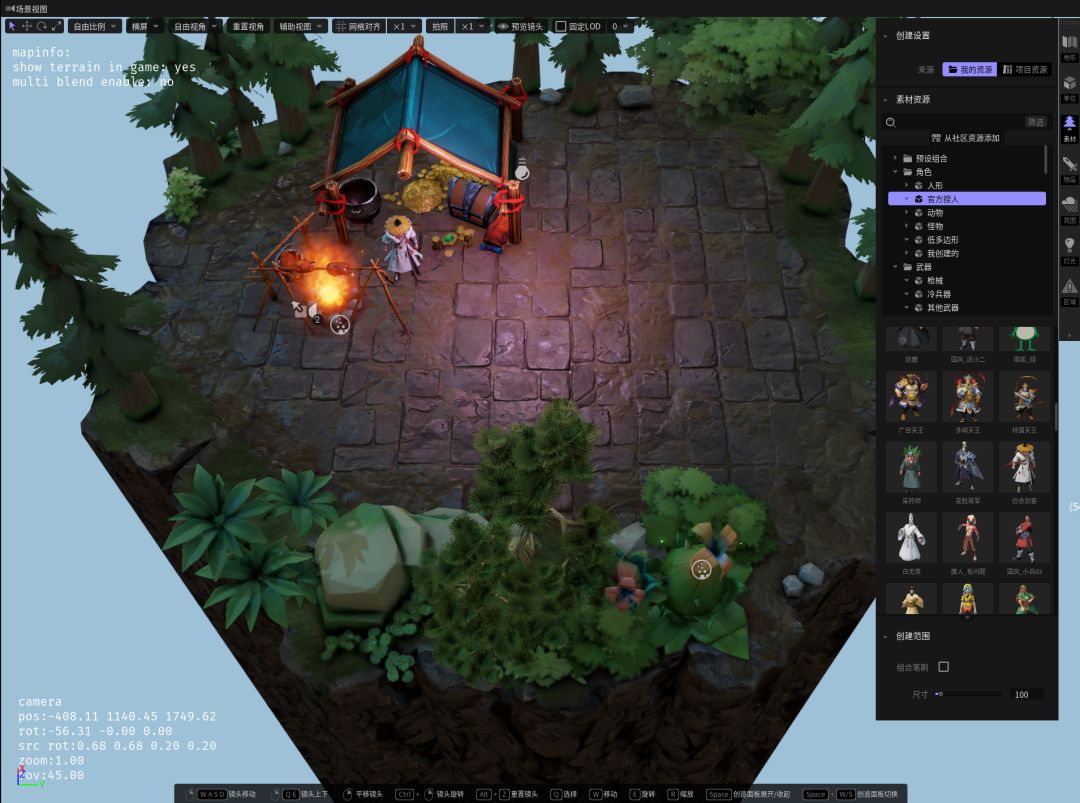 首先我们找到编辑器右侧的素材栏,可以看到编辑器内已经有了很多预制的素材。选择【场景】中的【植物】页签,能看到有各种各样的树木,这里我们可以先试着在地图边缘搭一些松树(P2)
