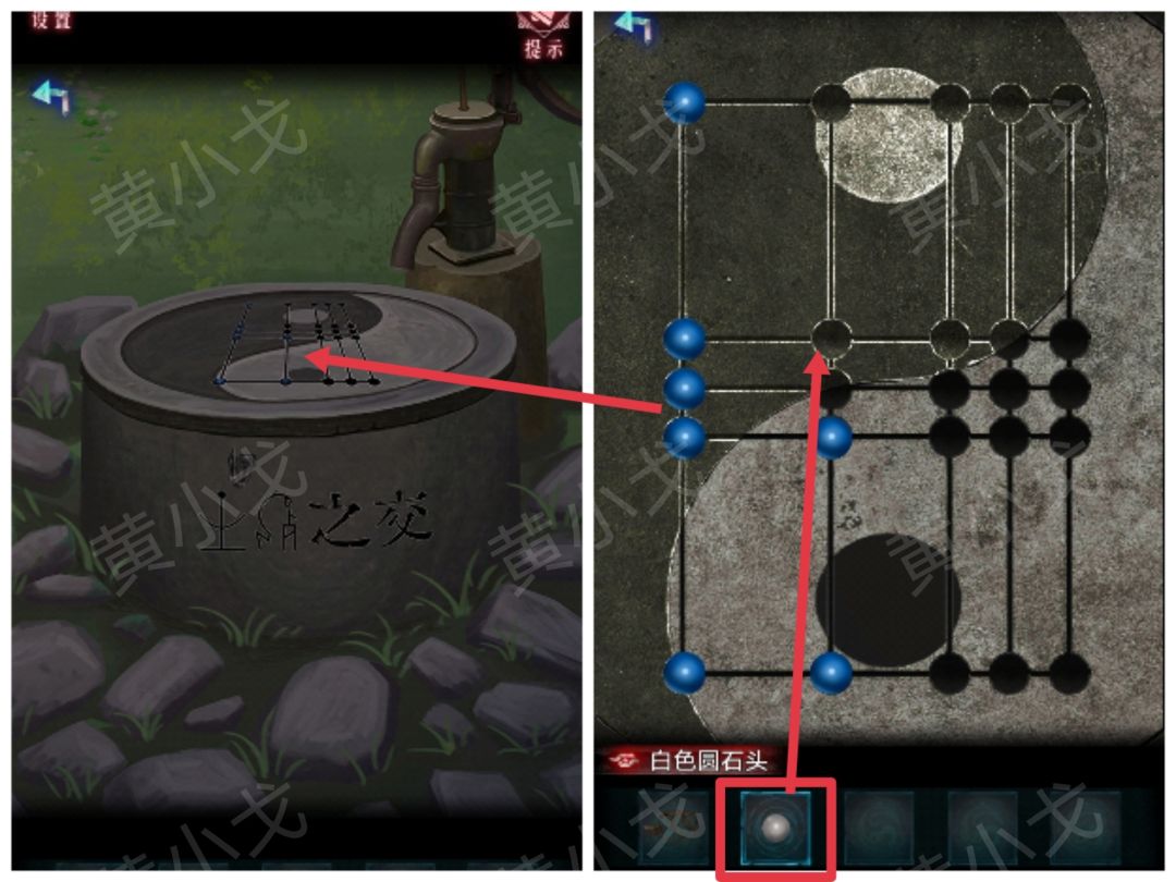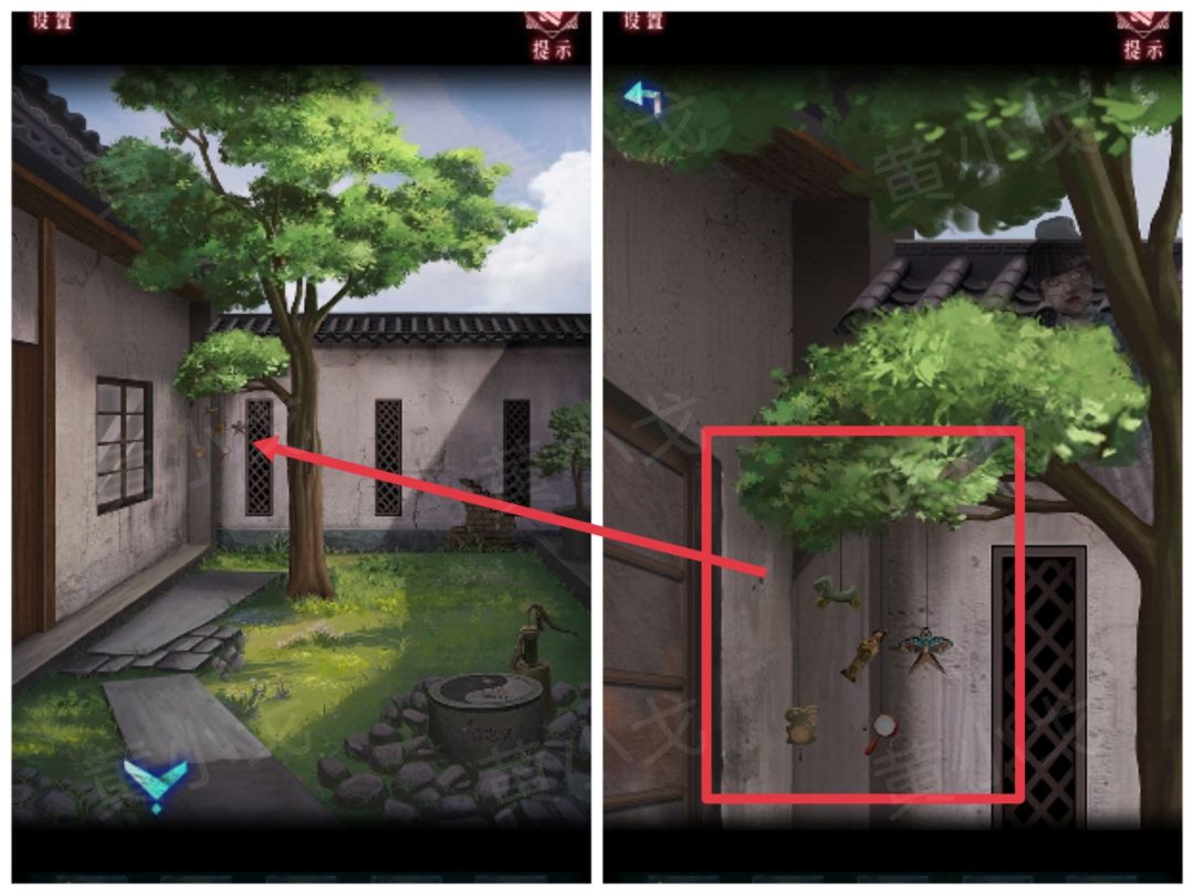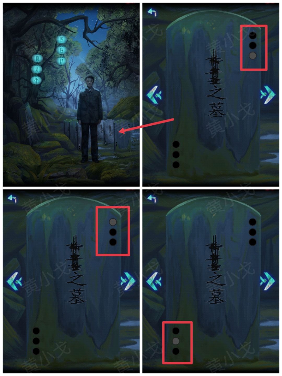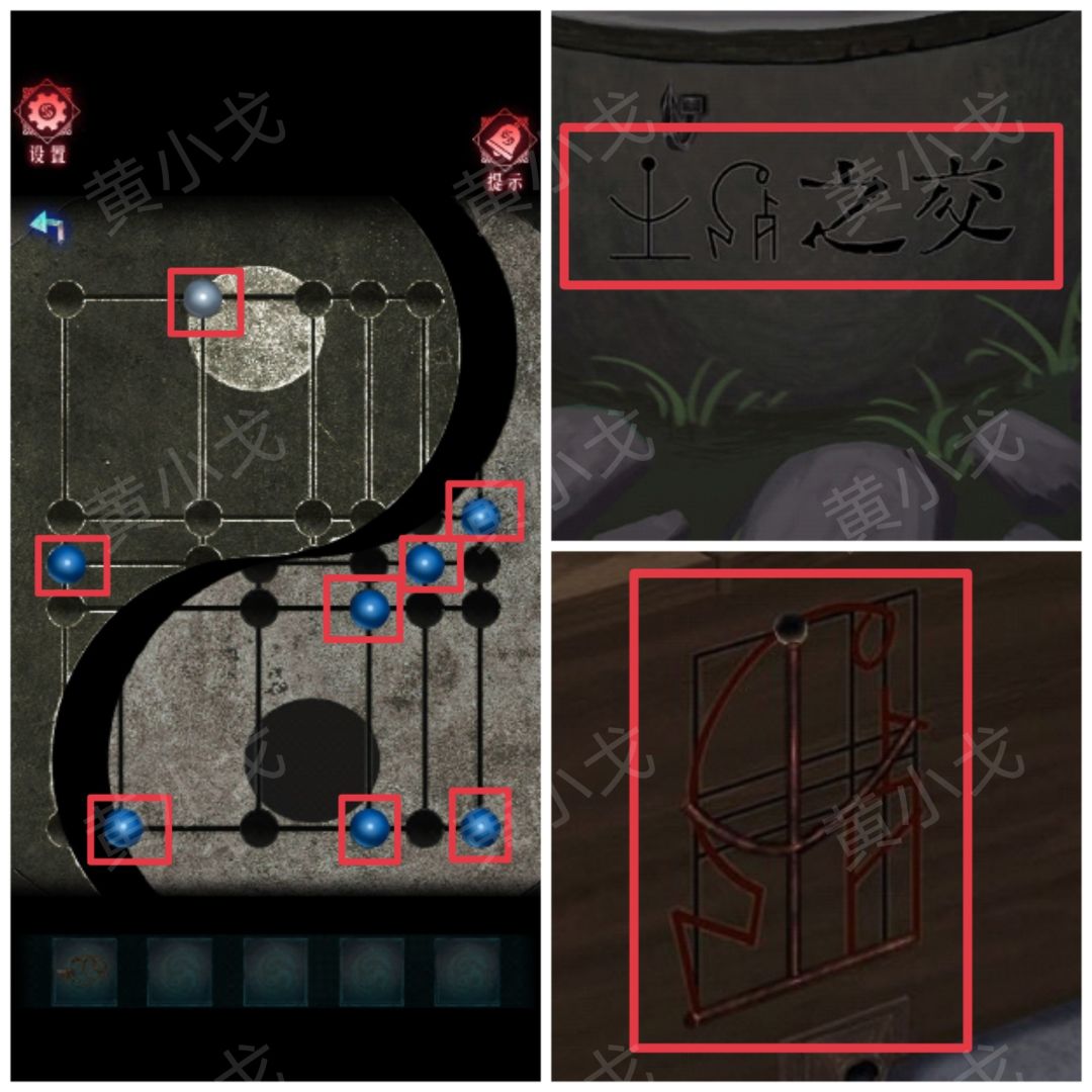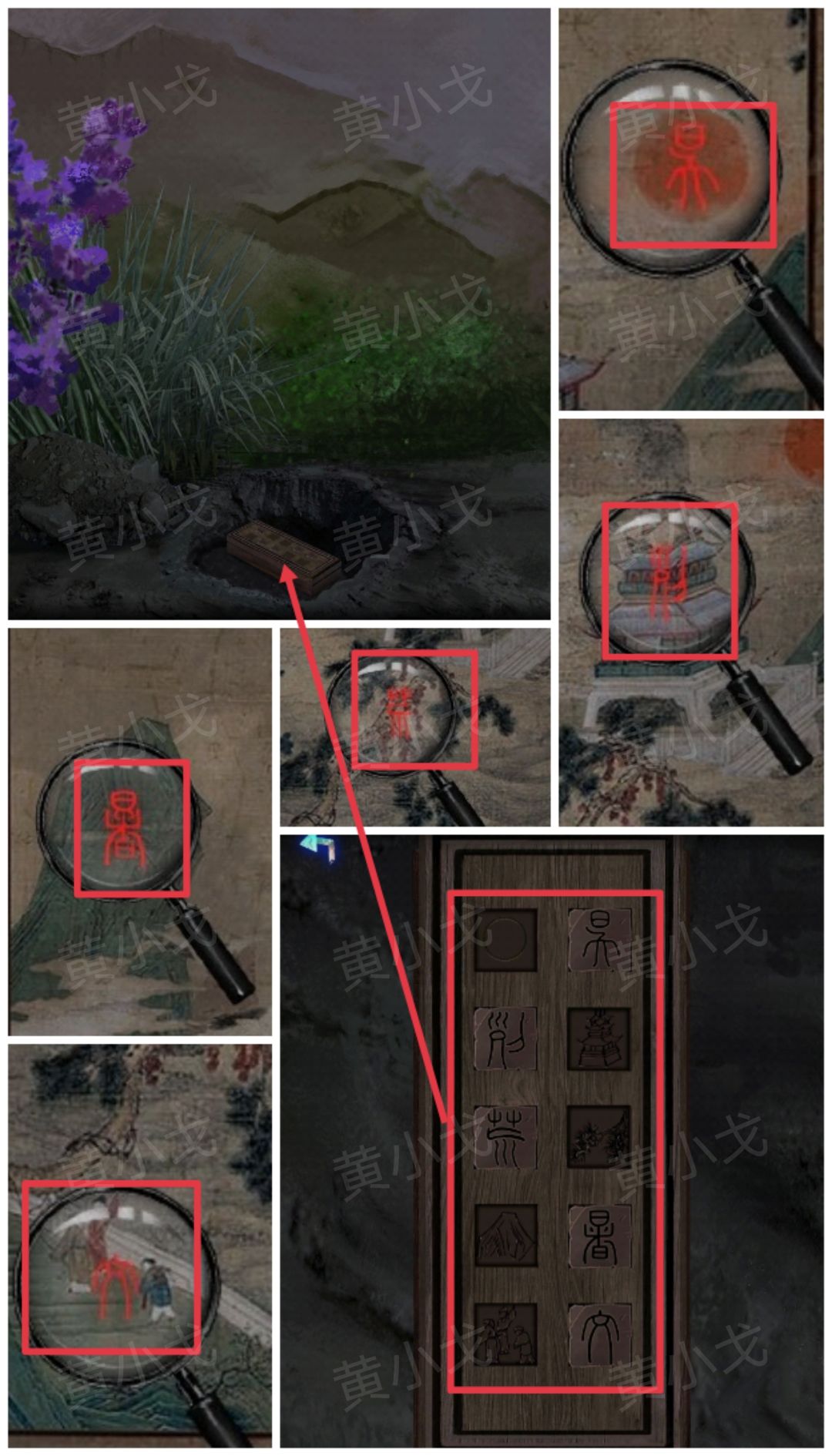 10.点击土坑里的盒子,根据凹槽上的图案,结合对挂画使用放大镜后得到的图案线索,调整至正确的文字
