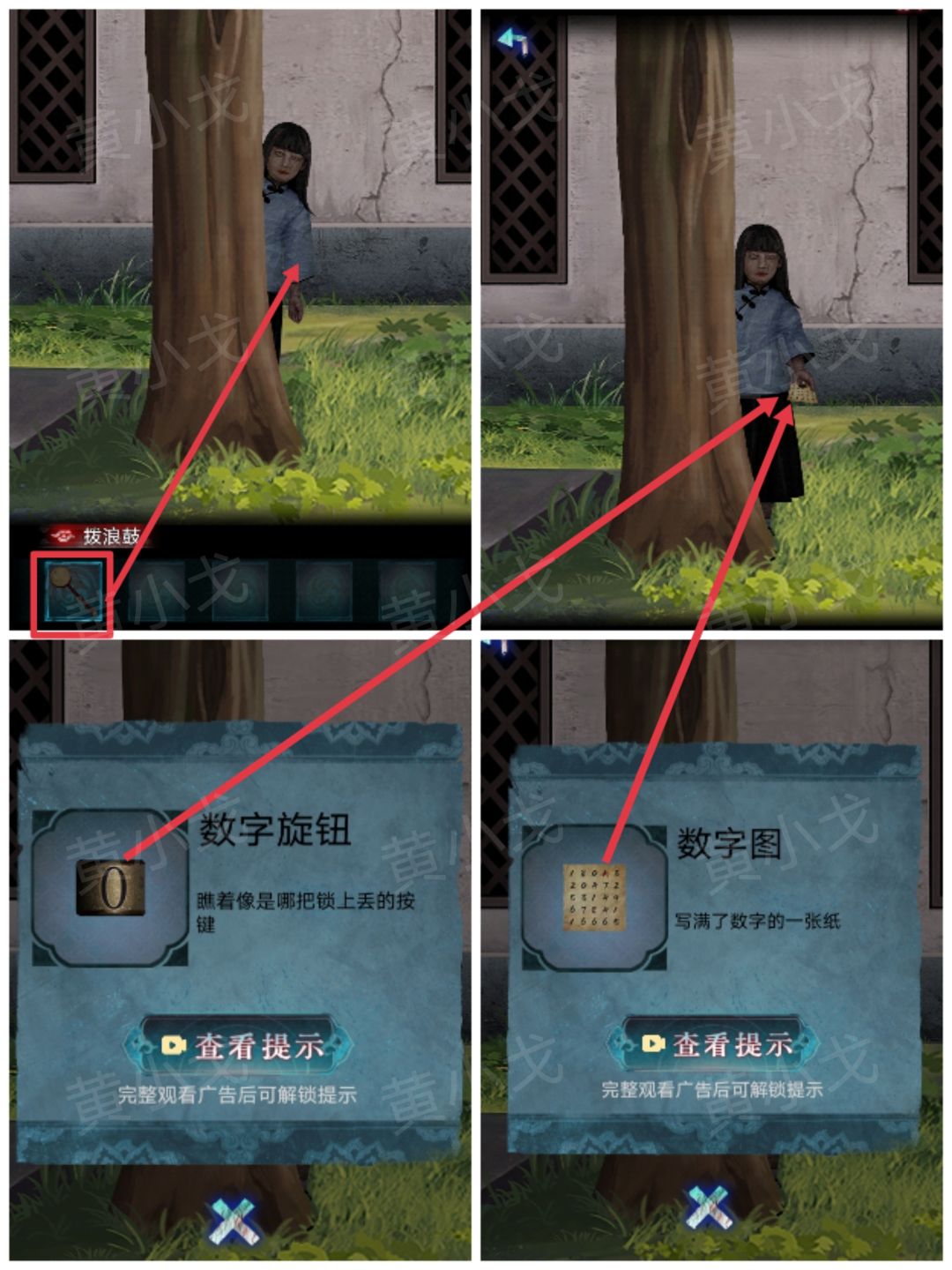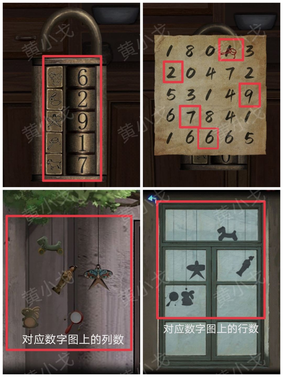 14.根据旋钮上的图案提示,结合【数字图】中拨浪鼓的数字坐标、窗户上的影子和树上的挂件位置,输入密码:62917