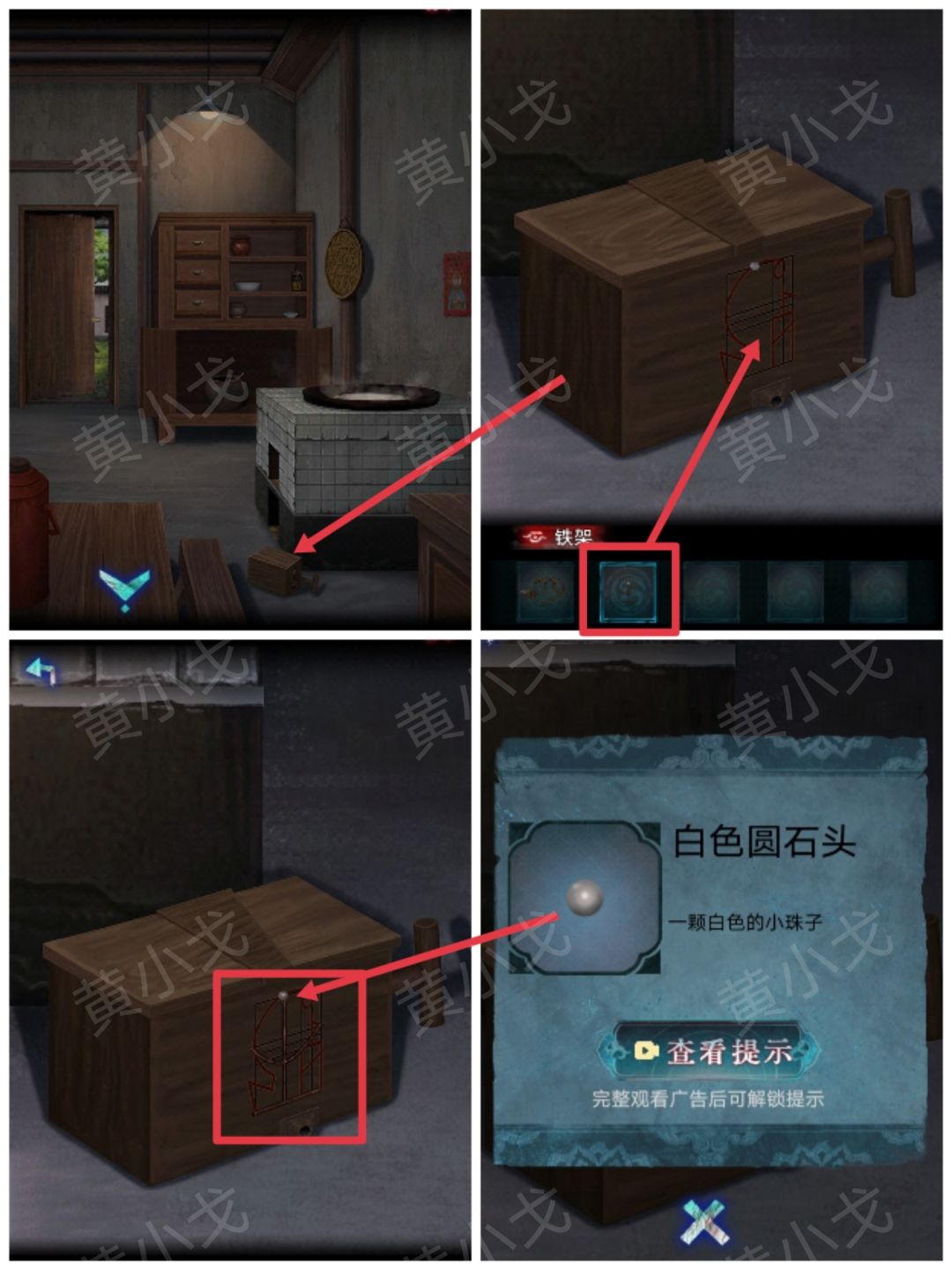 16.点击灶台旁边的风箱,装上【铁架】,获得【白色圆石头】