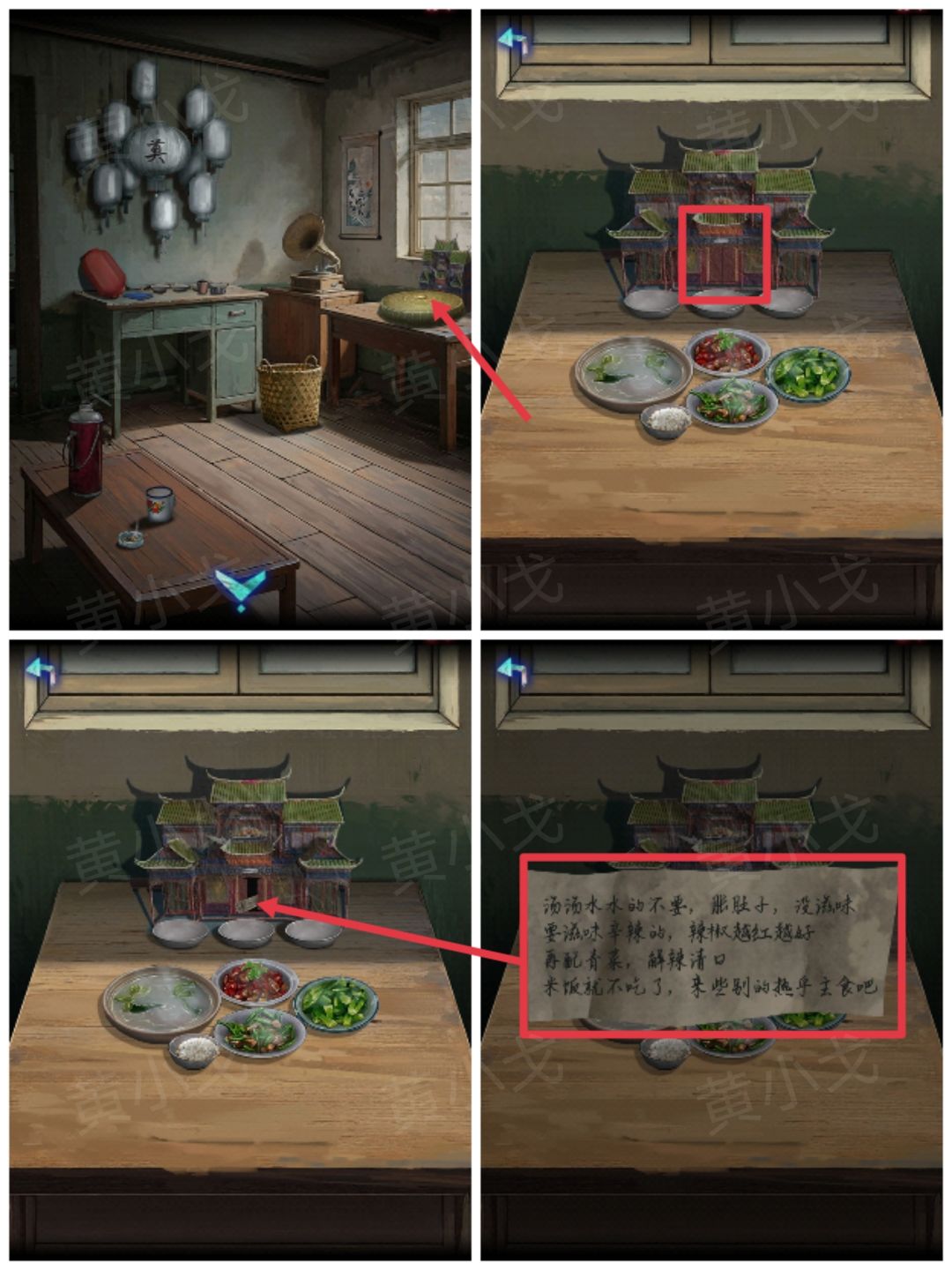 2.点击桌子上的纸扎屋,打开门,查看纸条内容