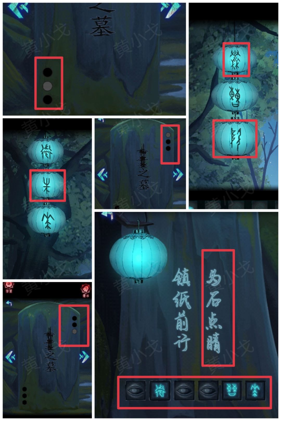 25.根据石碑上的文字“为石点睛”和石块上的符号,结合灯笼上的符号及灯笼的位置、右侧石墓碑上灰色圆点的位置,将对应的石块翻转为眼睛