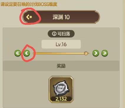 打不过后可以在召唤界面召唤之前打得过的BOSS,上面的箭头可以回到上一个深渊,下面的箭头可以调当前深渊BOSS的等级。