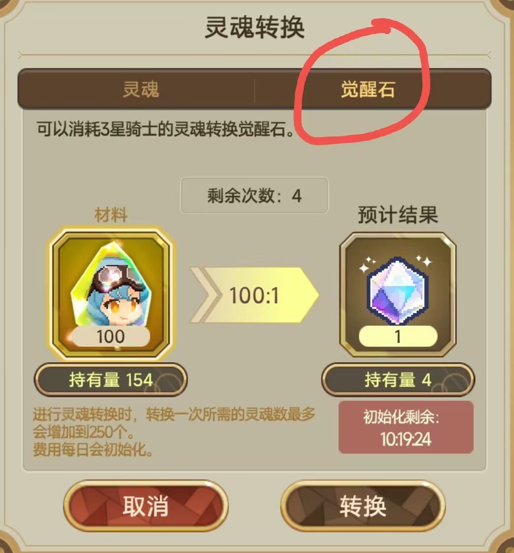 每天十次转换全用,用一星二星角色转换成需要的三星碎片;觉醒石前期一天换一个。