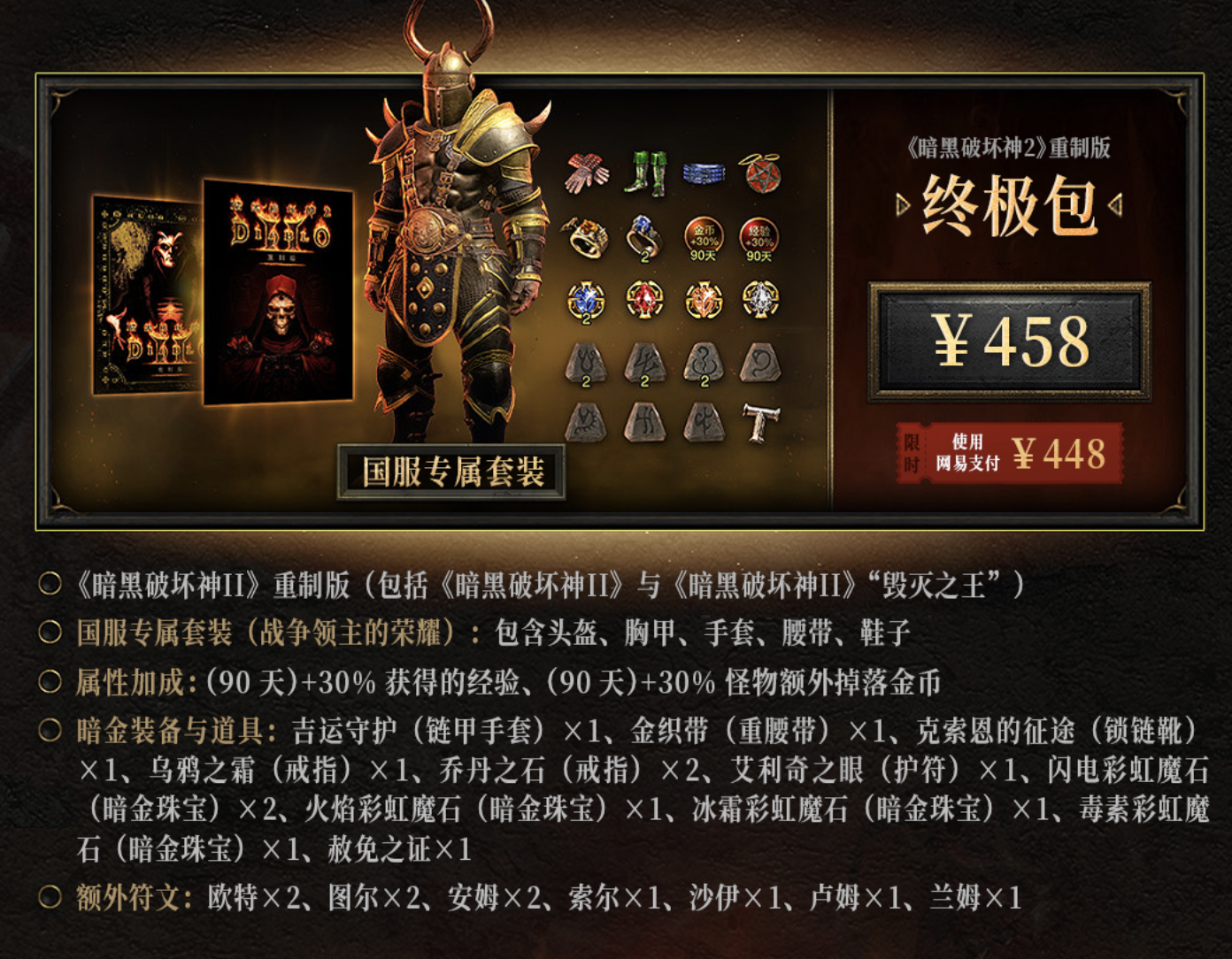 与国际服相比,国服的《暗黑破坏神 II》重制版还有不少变动:首先是游戏定价,国服标准版仅售 168 人民币,相比国际服 39.99 美元的定价低上不少;另外,国服还会额外推出豪华版与终极版,售价分别为 288 元和 458 元,比标准版多出包含「乔丹之石」在内的一些暗金装备、初期符文以及经验与金币加成 —— 终极版更是直接附赠了一身全新设计的五件套装备,新鲜感十足。