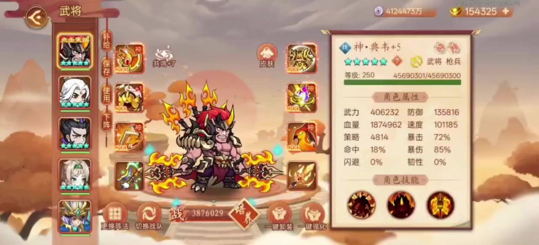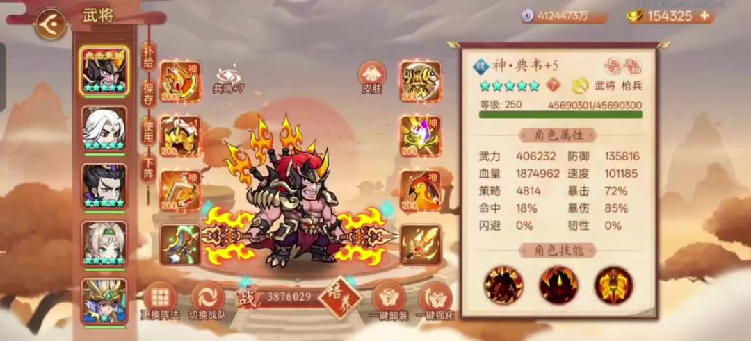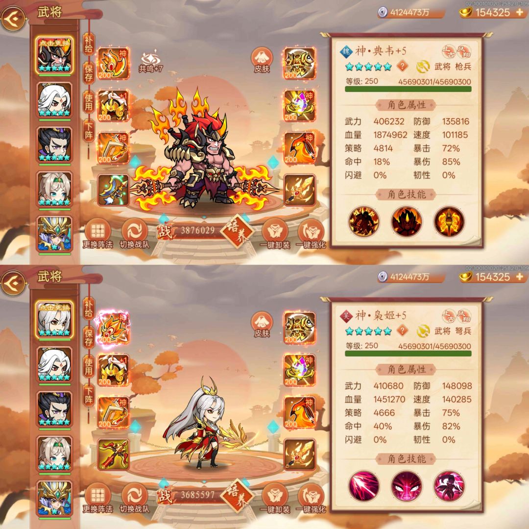 属性图:重铸神典韦4级 重铸神孙尚香2级(目前本人没多余旗子升了,还是靠白嫖和打攻城摘星阁攒下来的)