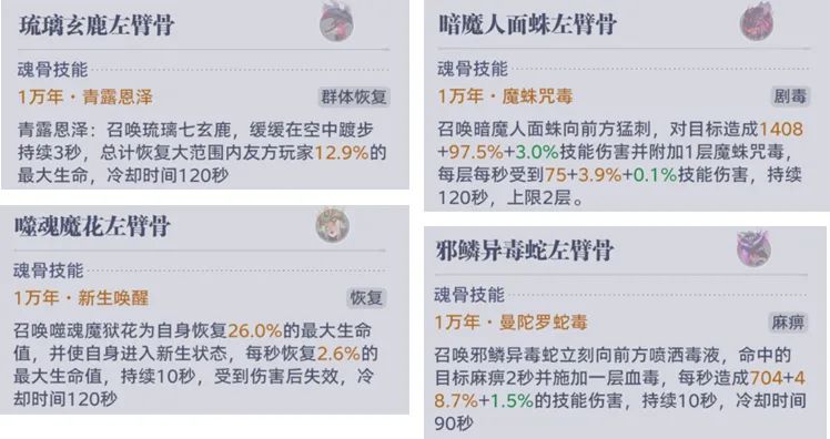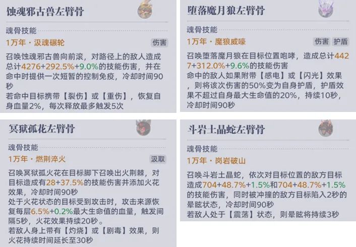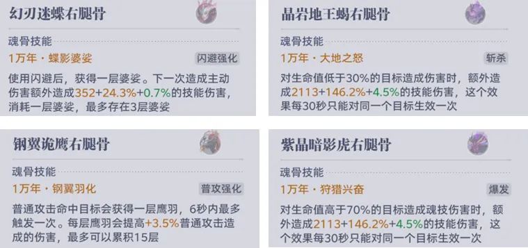 - 银翼龙:伤害+敌人“中毒”或“灼烧”状态时的下次魂骨技能增伤