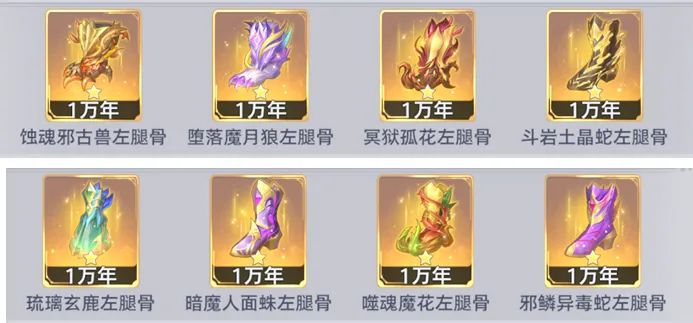 针对左腿的8个魂骨,几乎全部都是减伤或回血类的效果,不过从功能性上分析,维一个人还是倾向于选择噬魂花或者邪麟蛇(敌人控制技能较多时可考虑),当然如果是火队选择“冥狱花”也是一个不错的选择,但满足低于50%血量即立刻消耗所有火种的设定,在部分场合可能达不到最佳的回血效果。
