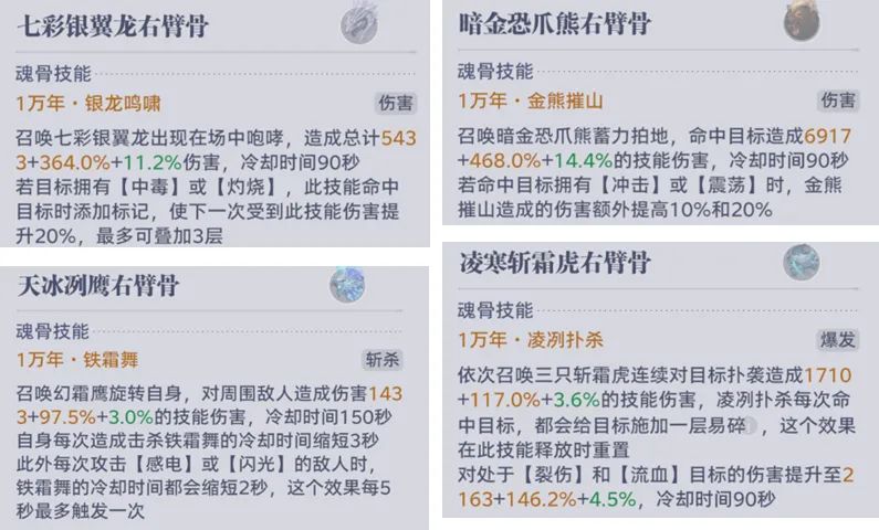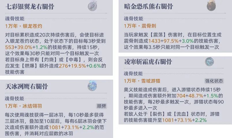 - 银翼龙:造成固定次数的持续伤害后有额外伤害+敌人“灼烧”或“中毒”状态时的额外魂骨技能增伤