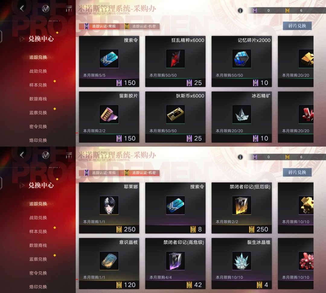追踪认证–机密 获取数量比较少,建议可以攒着直接兑换复刻狂级角色或者搜索令。其余的不推荐兑换性价比极低。