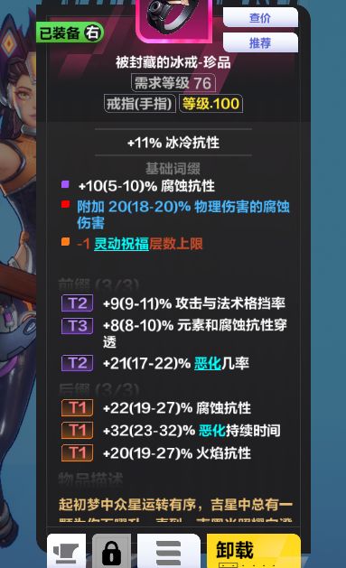 买恶化持续时间的底子来敲。因为主要就是那个磁条敲一下贵。然后解梦任何属性都行。大概800火一个戒指。刚开始不要太花钱在上面。只要有恶化持续和恶化几率就行。