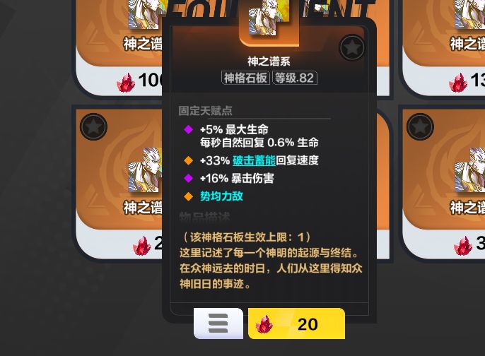 我卡的破击回复500冷却。所以每条板子上都要有破击回复33,这个很便宜全部几十火一个。后来我发现宝宝上也可以上天命破击。板子上就不用卡那么死了。