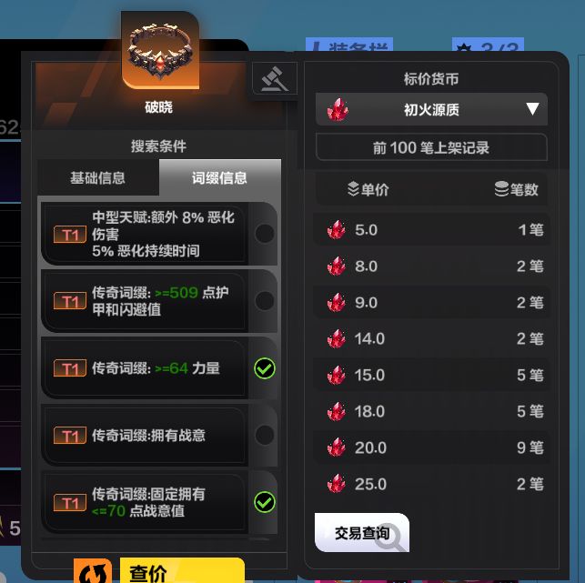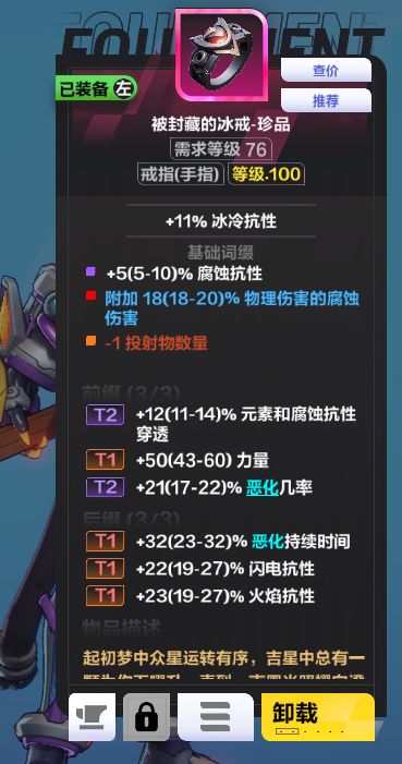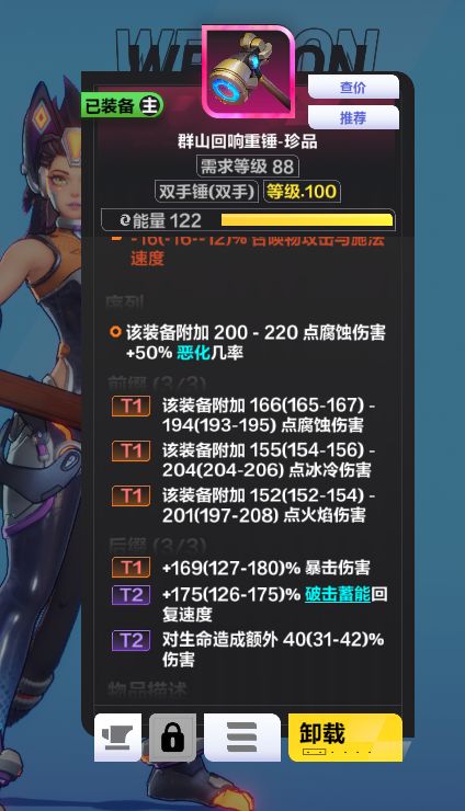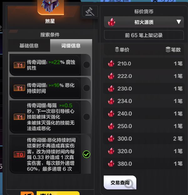 武器别去买成品。买个点伤序列的。最好是麻痹闪电点伤,恶化几率可以在板子上找。我这把主要是便宜300火买的。前缀点一下2火很好打T1,后缀就比较贵了。点了好几下。大概1000火打造完毕。解梦一下,如果是T1点伤输出更好,我解出爆炸就继续用了。