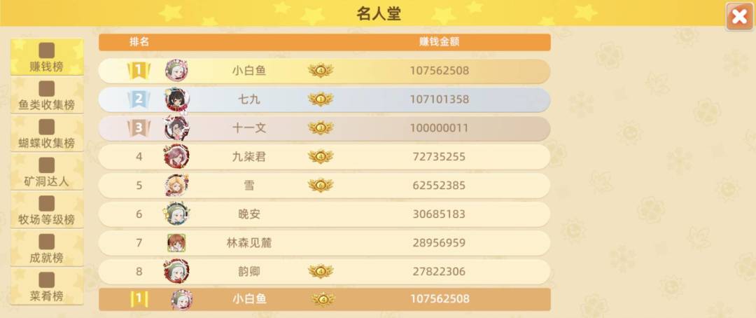 恭喜 小白鱼!七九!十一文!(三人不分前后,理论上小白鱼比十一文还更早一些!只是有界面刷新问题!需要周一再去核实,但是三位同时晚上达成亿万富翁是真实可信的!)成为七测,达成亿万富翁成就的前3位玩家!