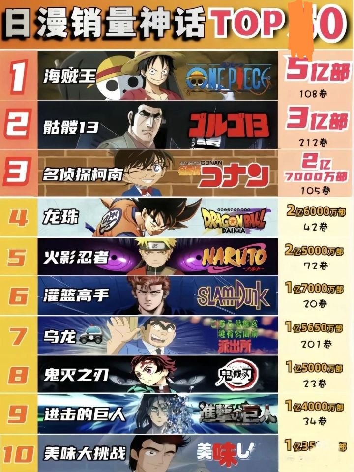 日漫销量巅峰榜前10:海贼王5亿领跑