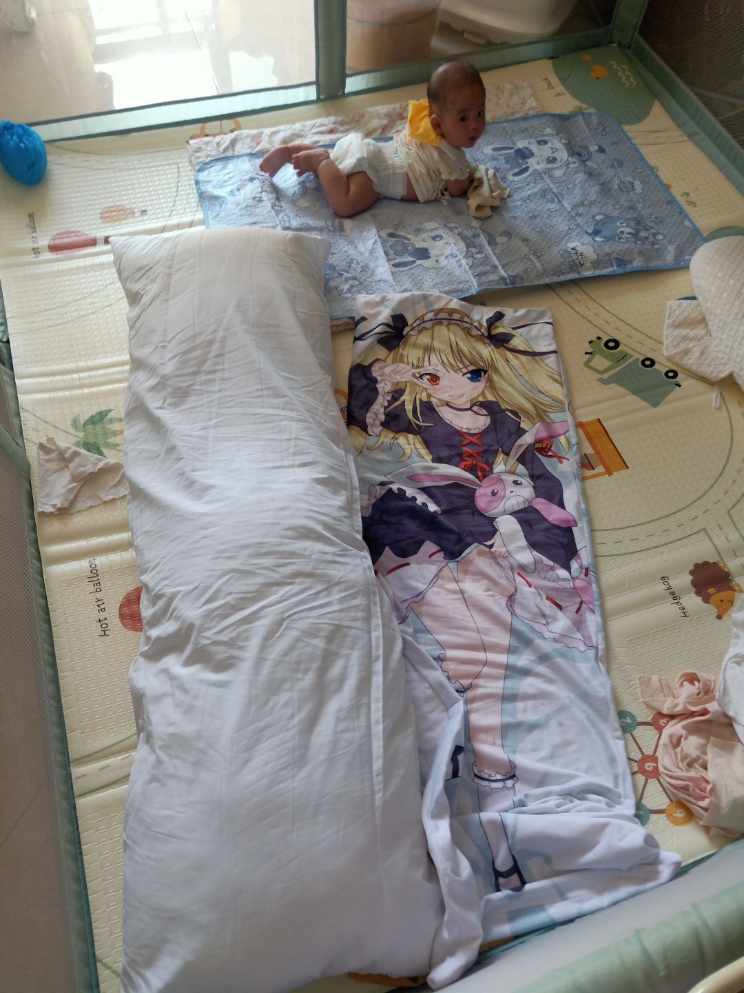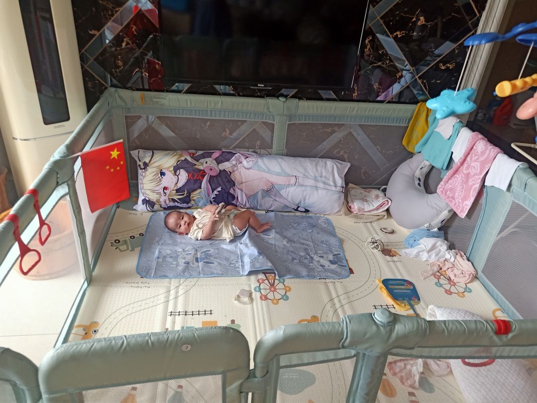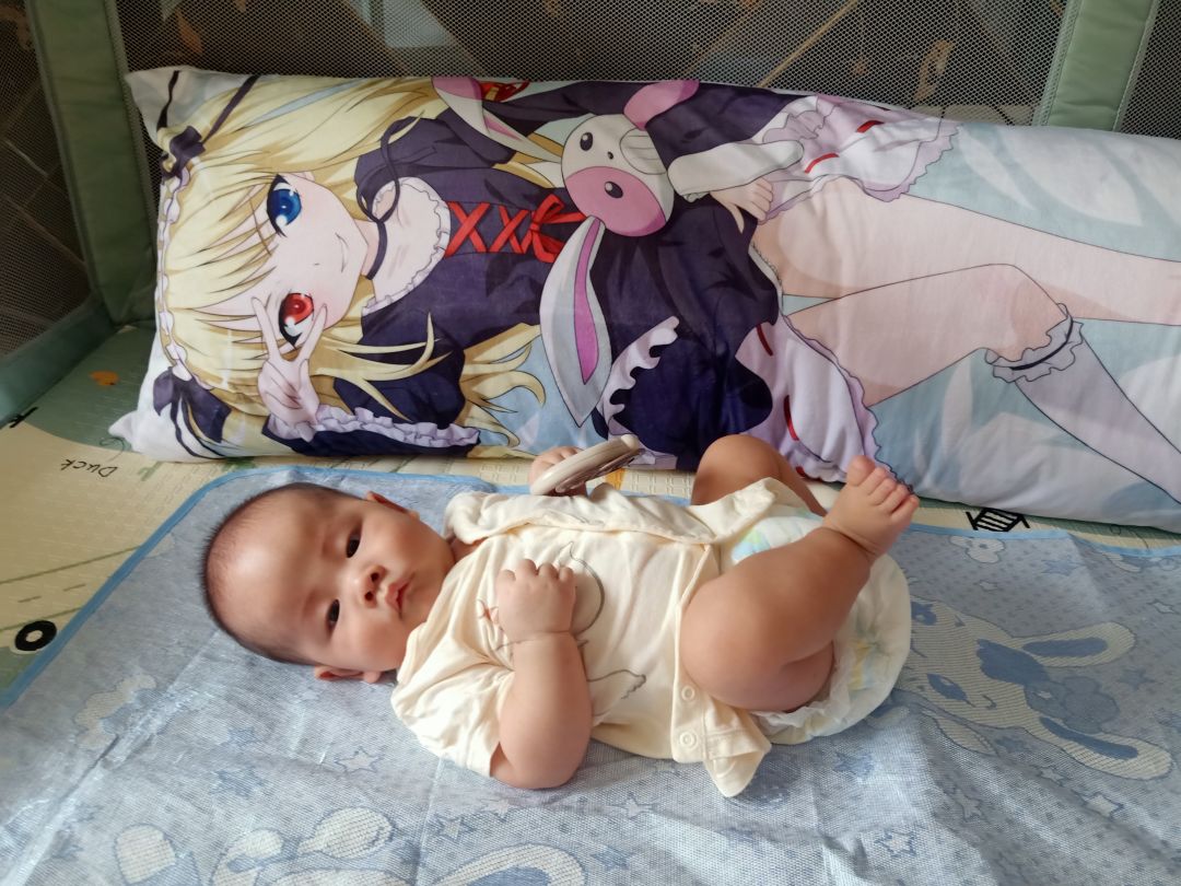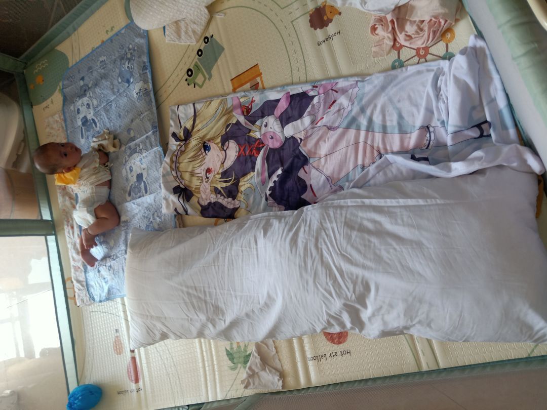 【带娃】【萌娃】以前年少时候买的抱枕,没有想到为了幺儿,还有正大光明从柜子里拿出来,在老婆面前摆出来的那一天。——(因为墙边有插线板,有安全隐患,抱枕可以把墙边上的插线板给挡住)