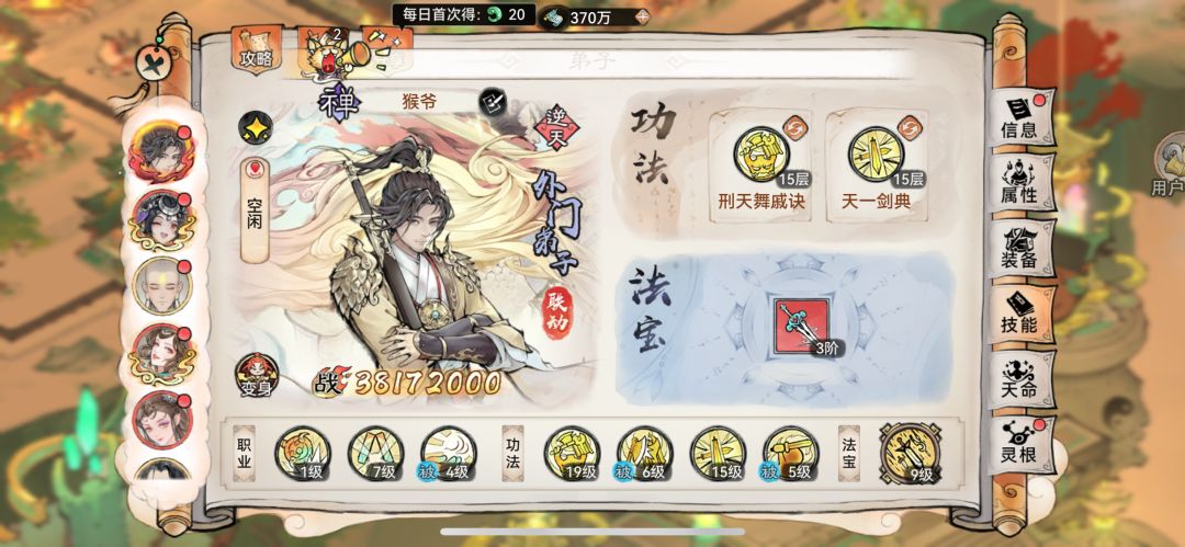 1.输出金猴:平民建议把飞升前的土猴转成金猴带免费的刑天➕天一(这两攻法用途也比较广泛),3阶法宝用金骨或者金庚精,后续要出的四阶可以留意下金叶。至尊宝是一个很万金油的角色,爬塔,后山灵阵,五行圣殿火土金灵根,仙墟,基本各种日常玩法都有上阵位置。