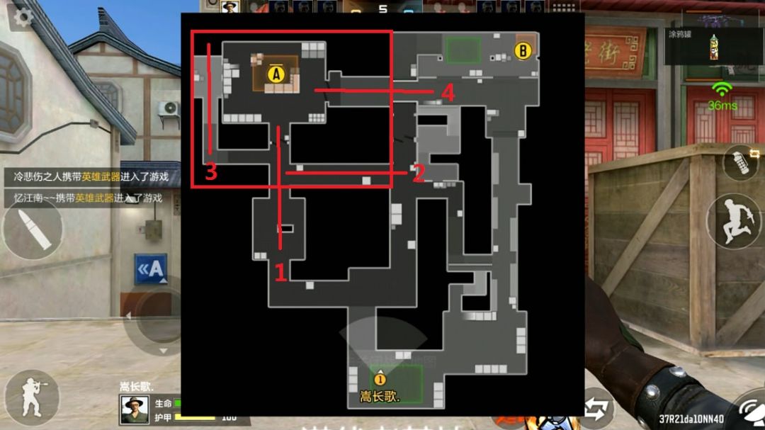 如下图所示,A点处于地图左上角,红圈内的区域就为A点区域。这个区域的各种战况和行为能直接影响到A点。在该区域内有四条路可以进攻到A点,1路为A大道,基本为潜伏者常用进攻路线。2路为A大道与中路的连接路线,有一定的空旷距离,3路为A门右拐二层攻击路线,4路则为B点与A点连接路线。不论是攻击和防守,潜伏和保卫玩法大同小异。开局潜伏攻保卫守,安包后保卫攻潜伏守。