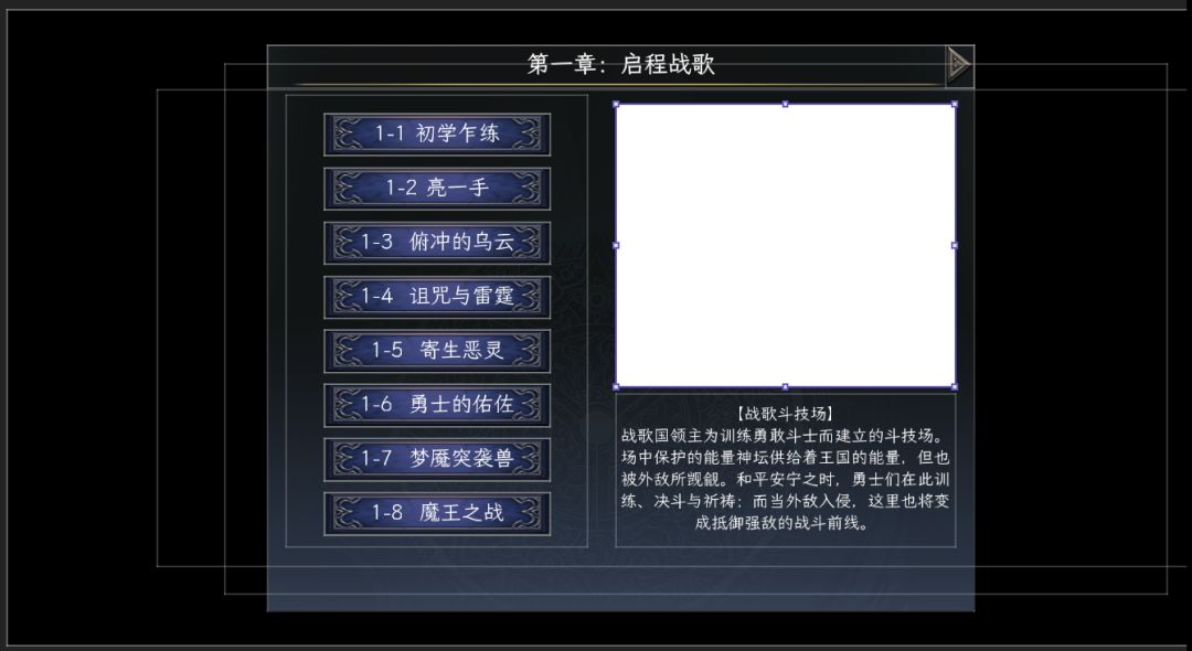 至于选关页面的右半边,则可用一张图和一块文本区予以排版。图片部分(P6白矩形区域)将会显示玩家选中关卡的预览,而图片下面的文本框则用于显示玩家选中关卡的文字描述。