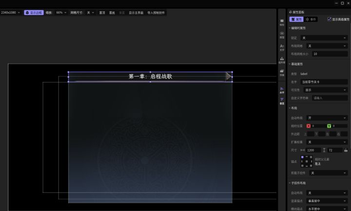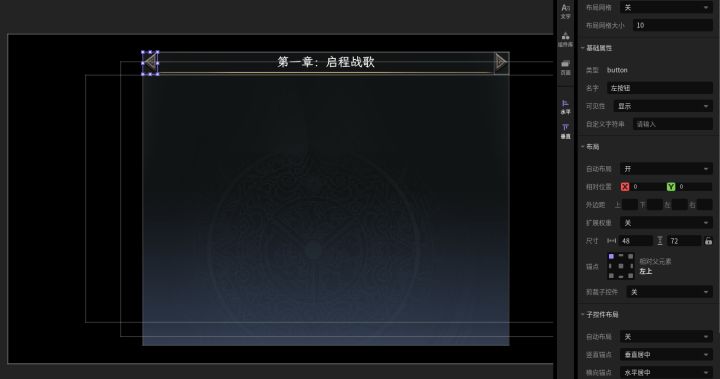 界面的设计还是从创建panel开始,然后在panel的顶端创建代表章节名称的label。游戏第一章的名称和内涵最好能燃起玩家的战斗欲,让他们对关卡内容产生憧憬(P2)在顶端标题栏左右各创建一个button用于切换章节。如果是第一章的话建议把左侧button按钮隐藏,这里具体功能后面在触发器实现(P3)