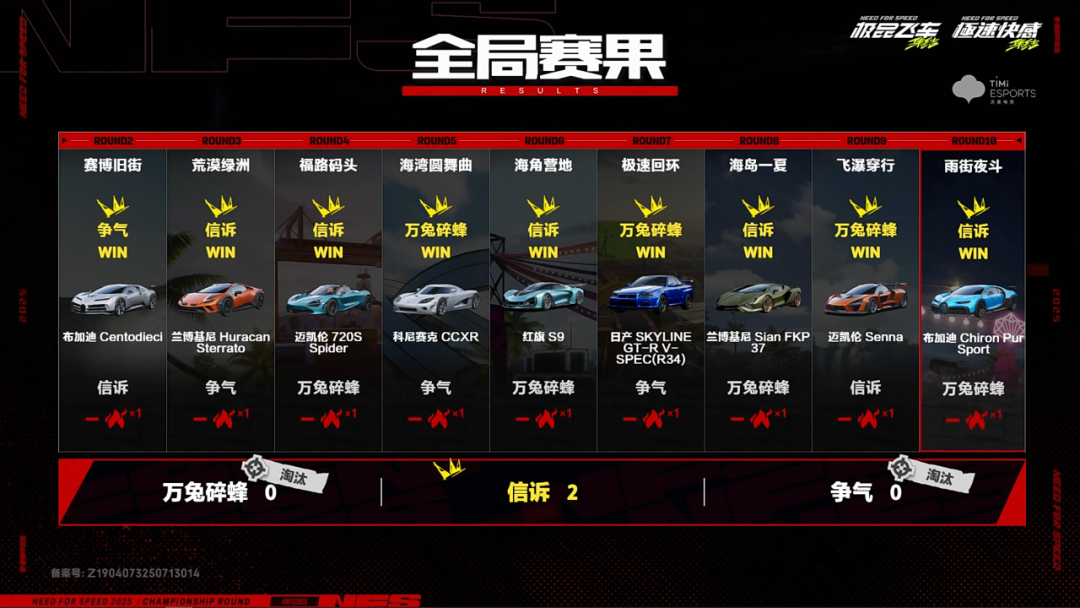 最后的对决在雨街夜斗展开,信诉几乎全程稳定压制,牢牢占据领跑位。万兔碎蜂数次以极限惯性过弯的操作紧咬不放,但最终还是信诉顶住压力冲线,成功进入总决赛!