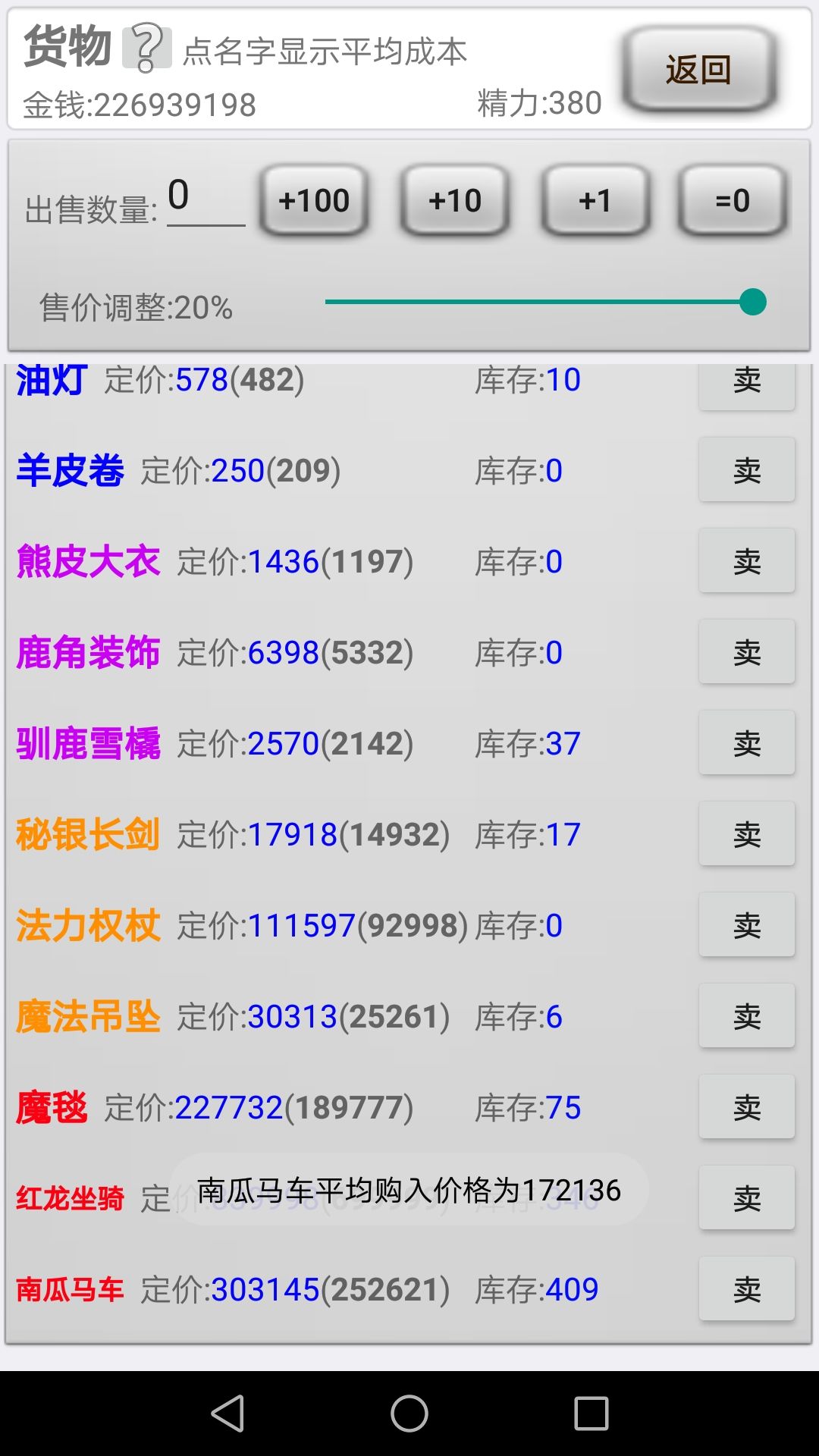 三百八十个南瓜马车,卖出136个,一个赚十三万,一次1768万;同样数量的红龙坐骑,卖出76个,一个赚四十四万,一次3344万。对比之下,商品二同等精力赚钱更多(仅一次实验,但差值确实大)