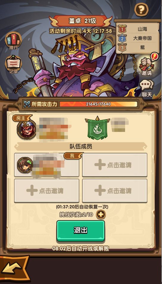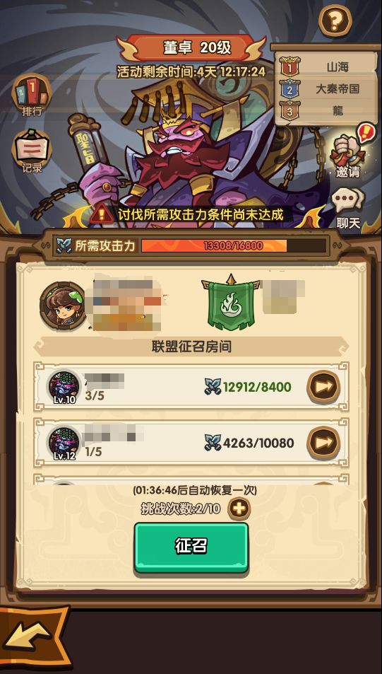 3、个人攻击力未达到讨伐攻击力要求时,可征召联盟成员参与协助,征召成员攻击力总和达到讨伐董卓攻击力要求时,可进行征召讨伐。