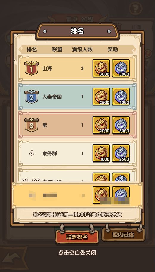 7、依据各联盟讨伐董卓至满级的人数将会进行联盟排名,在玩法结束轮换时将以邮件形式向所有联盟成员发放排名奖励。