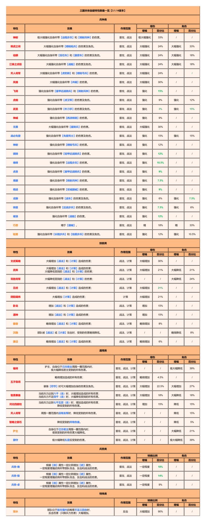 长戟步兵、枪盾步兵—五子良将、铁壁、轻勇、兵势绝最大增伤68.8%同时免伤为38.6%
