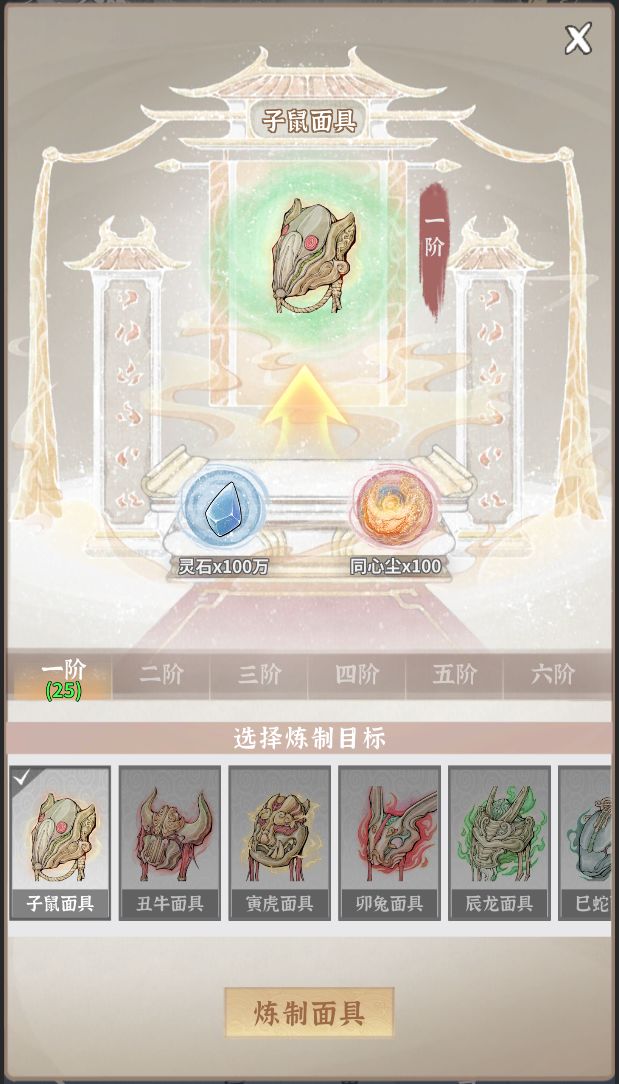 面具数值全部固定,无任何随机,1阶面具可通过挑战阵眼副本或消耗材料炼制,高阶面具由低阶面具合成而来,两个低阶合成一个高阶(例如2个1阶合成1个2阶,最高6阶)。