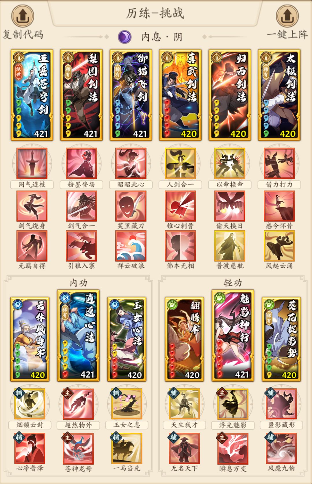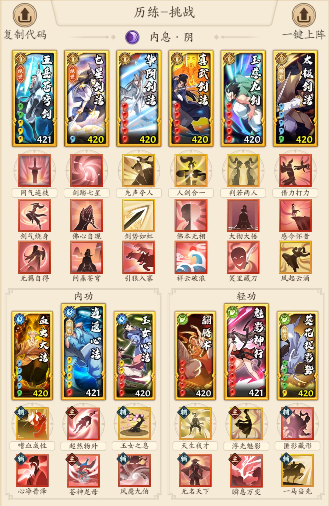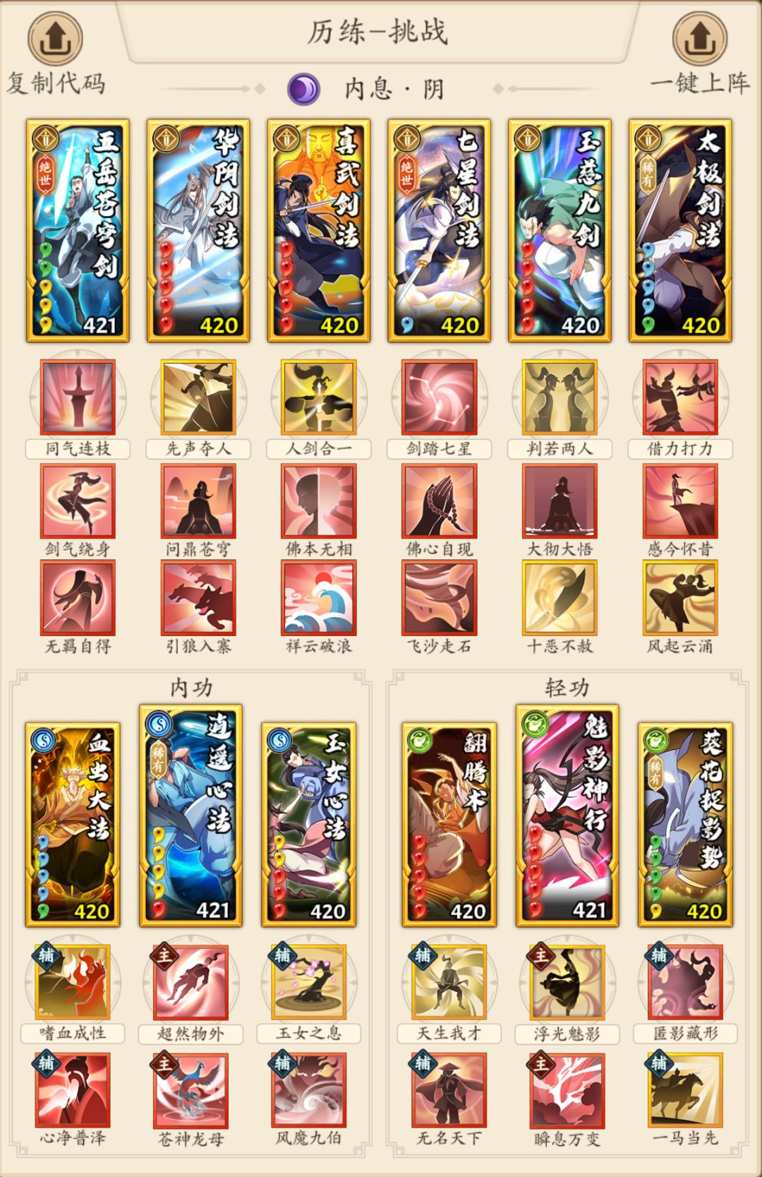 这是我目前主用的套路,后三剑真武、归西、太极,利用真武补伤害,归西打控制续航,由于判官后阴剑的打法模式变成前三剑出伤,后三剑防守的模式,所以后三剑也可以采用七星、天一、太极,搭配扶摇直上、坚如磐石、感今怀昔等招式进行防御过渡。除此外还有加入华山五式的续航流阴剑,但考虑目前环境及养成暂不推荐。