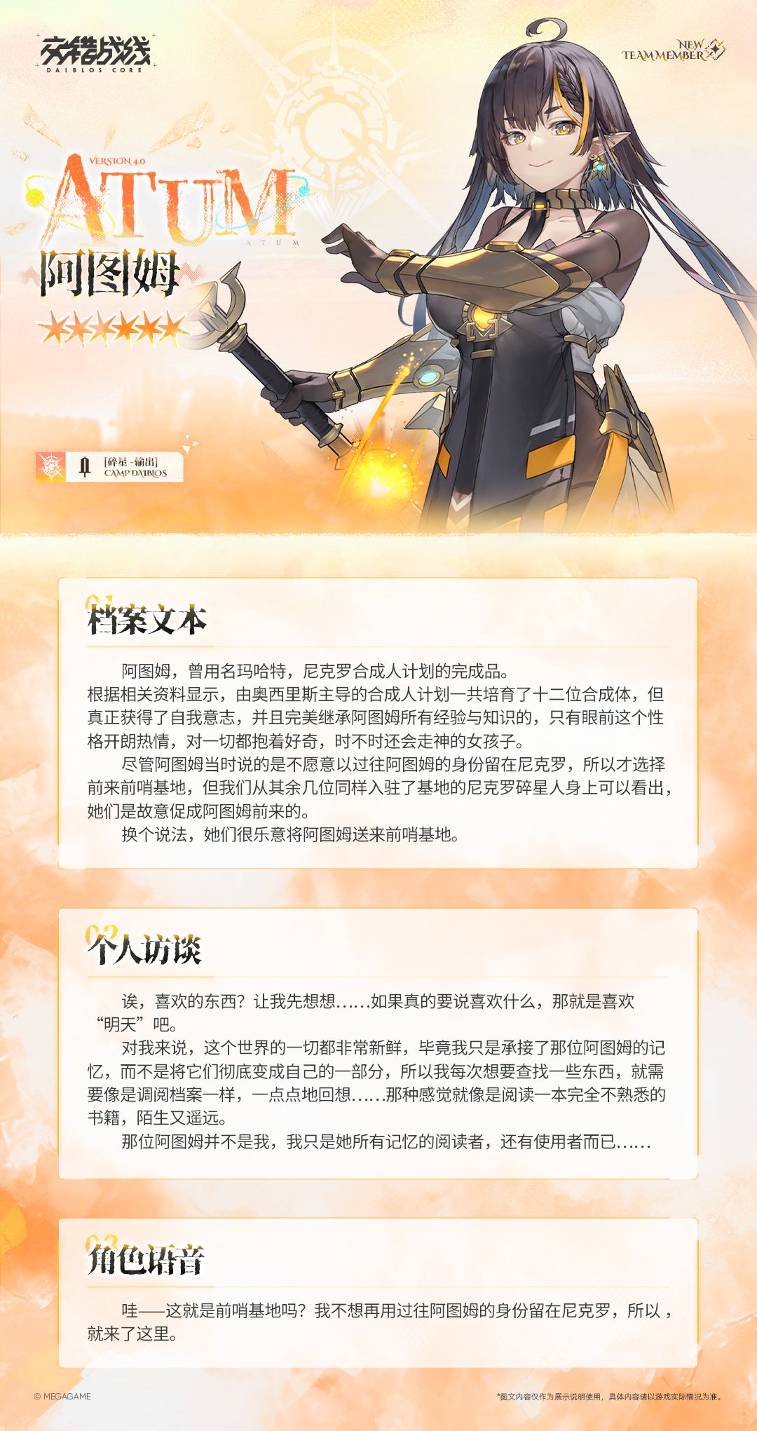 “哇——这就是前哨基地吗?我不想再用过往阿图姆的身份留在尼克罗,所以就来了这里~你一定会收留我的吧,总队长?”