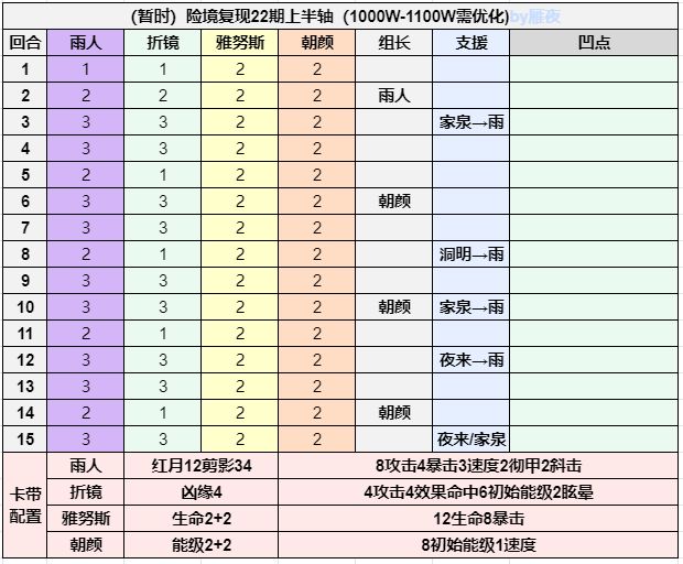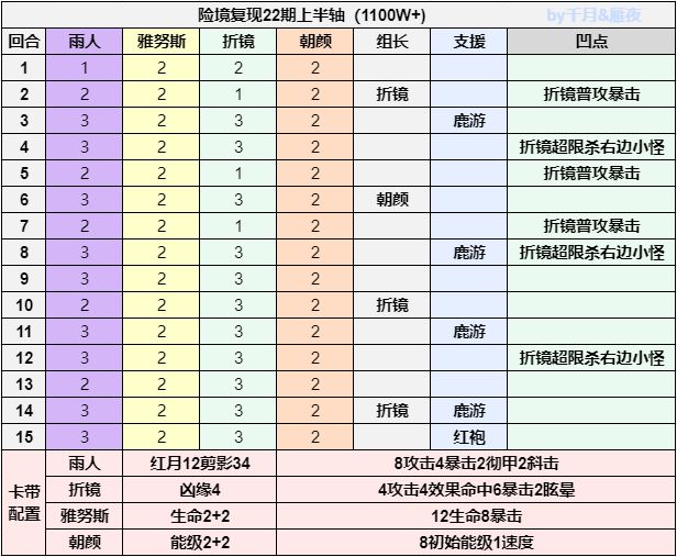 新的轴来了,比之前的难凹一些,但是能稳定提100W分,我感觉极限在1200的样子。主要的凹点是第四回合折镜打右边小怪的大招一定要暴击,不暴击杀不了小怪,雨人就必死无疑了。然后还有一个有四门雅努斯情况下明显提升的凹点,就是第二回合折镜的普攻要暴击,不暴击会导致雅努斯第9回合的自动战术延后到第10回合,然后会因为标记数量的原因歪到折镜身上。
