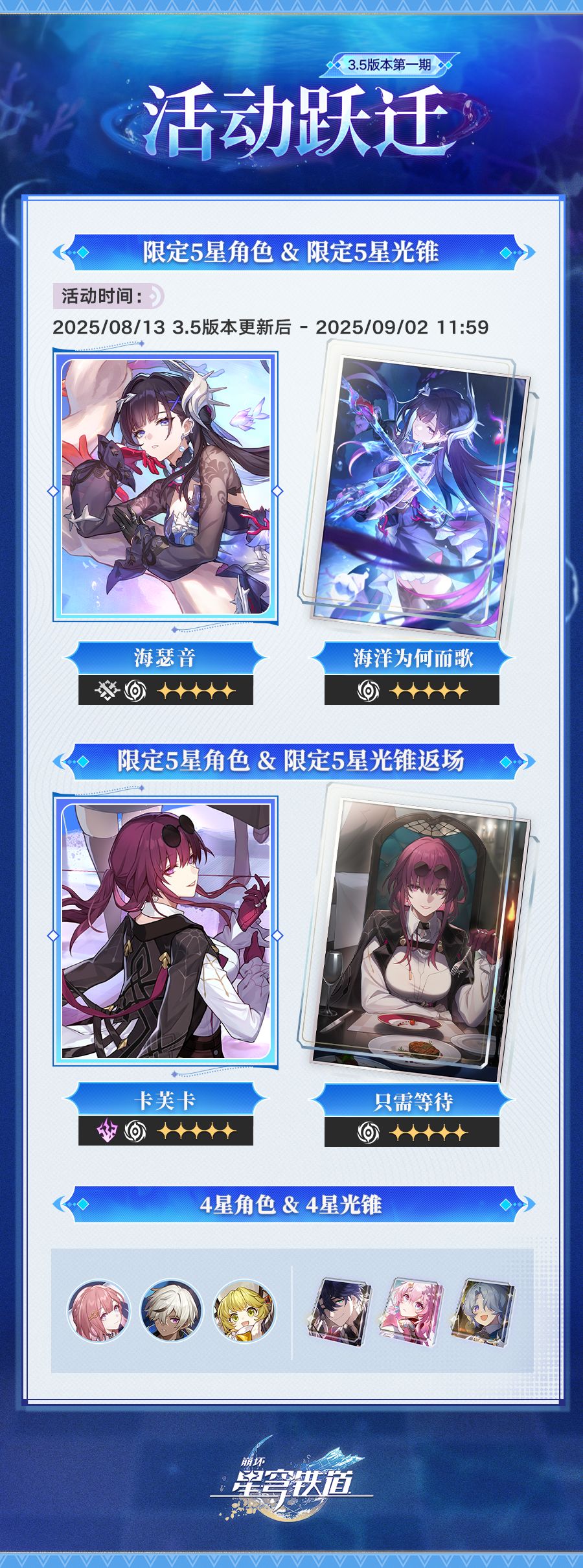限定5星光锥「海洋为何而歌(虚无)」「只需等待(虚无)」,4星光锥「猎物的视线(虚无)」「芳华待灼(同谐)」「铭记于心的约定(毁灭)」跃迁成功概率限时提升。