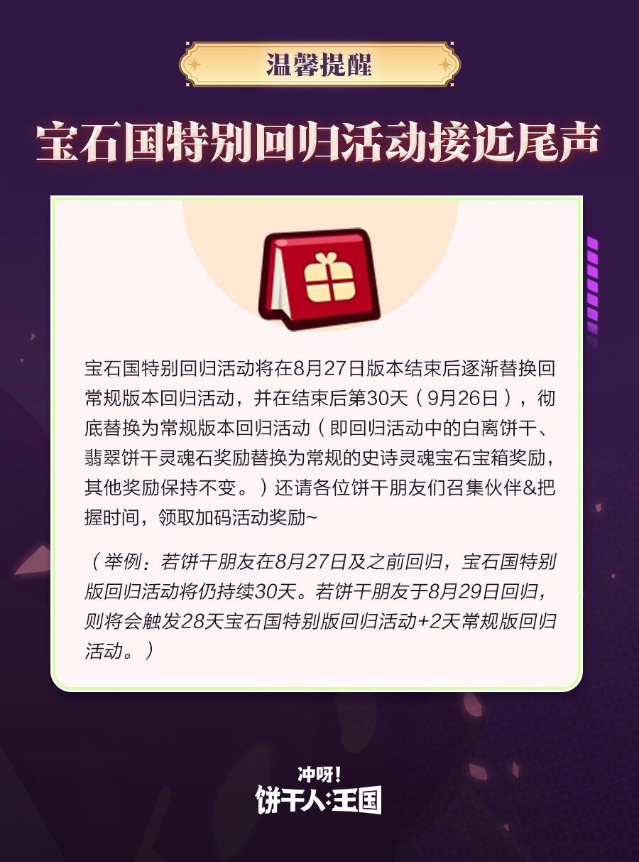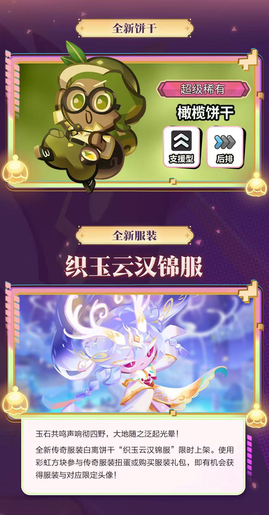 全新「守护之战新赛季」打响!全新饼干考古学家「橄榄饼干」开启UP,误打误撞来到宝石国的他,真正的目的地究竟是……?更有白离饼干全新传奇服装开启UP!在遗世的宝石王国,继续这场狂欢吧~