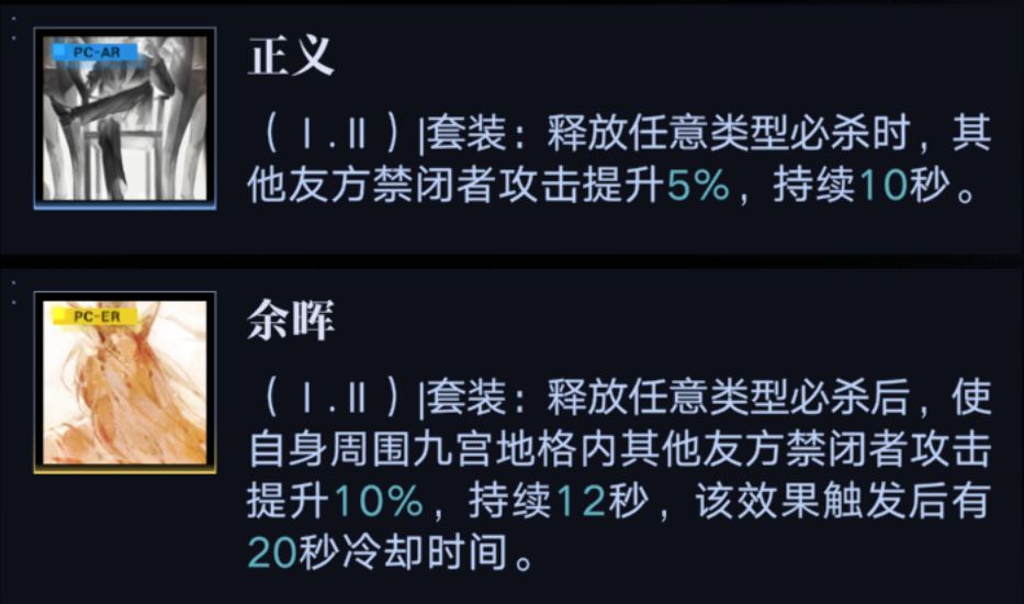 烙印推荐:心之殇+回廊,万用解;能量套,适合开局就需要破核的场景,只需要用一下局长技能就可以充满第一个大招,没有回廊那就空着,也无所谓的