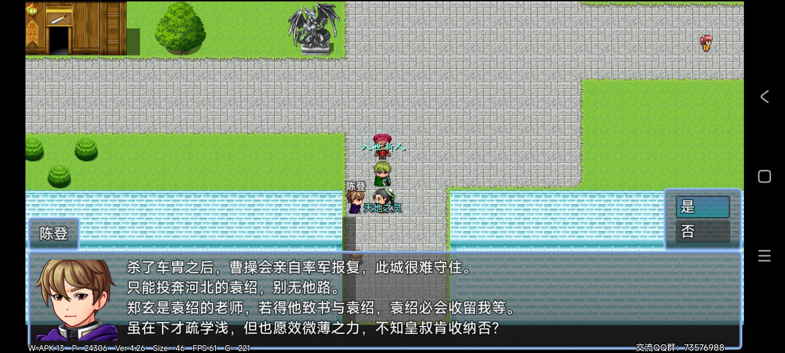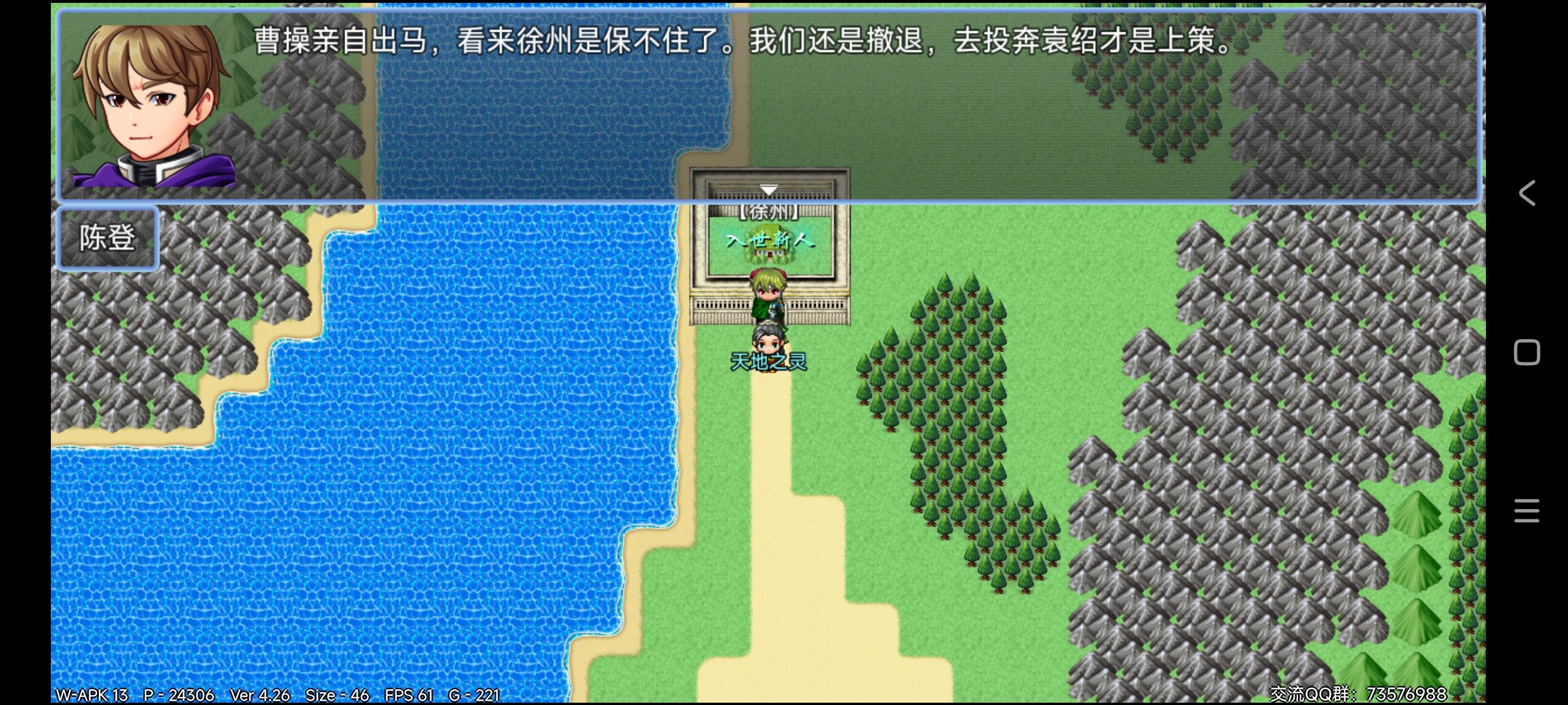 出城时对话陈登入队,此时记得把关羽和张飞装备全部下了,出城打曹操(剧情败,关羽、张飞暂时离队)