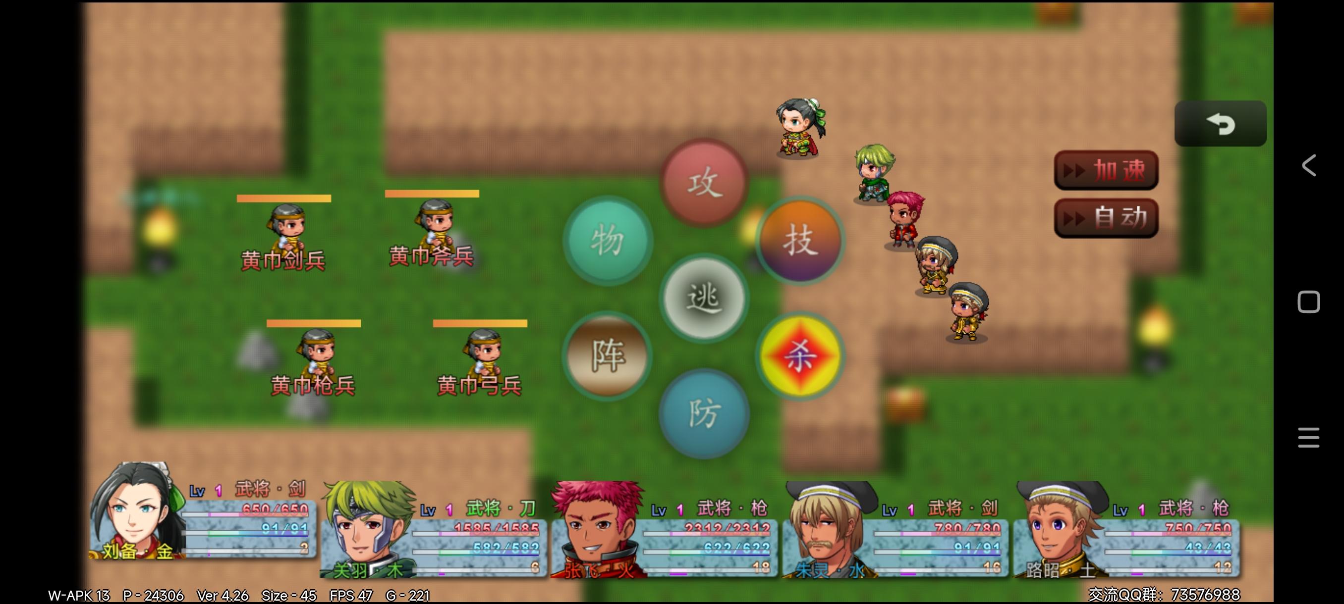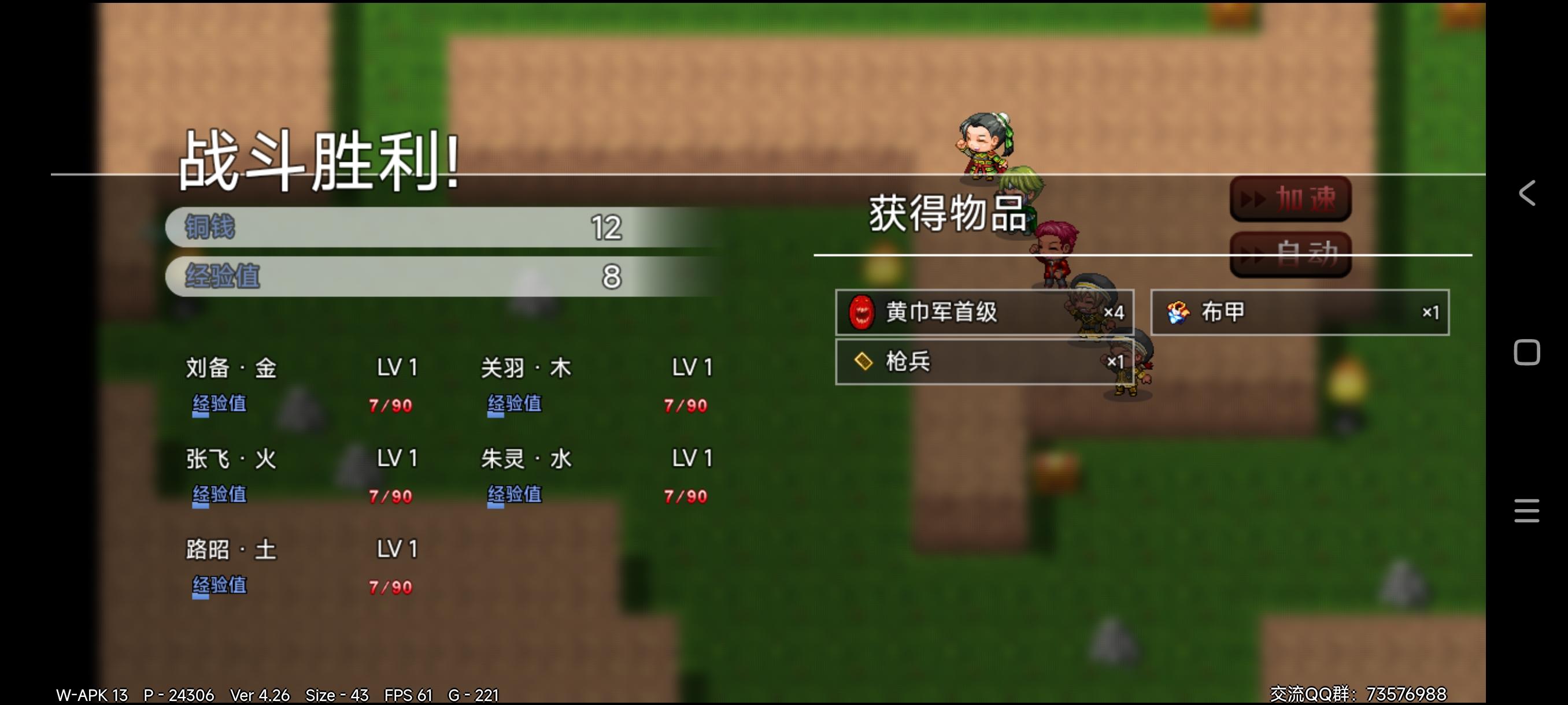 出城往上走,右边山洞打黄巾兵,洞内有宝箱有一封信必拿,也可战斗获取装备与卡片给人物都装备好,如图