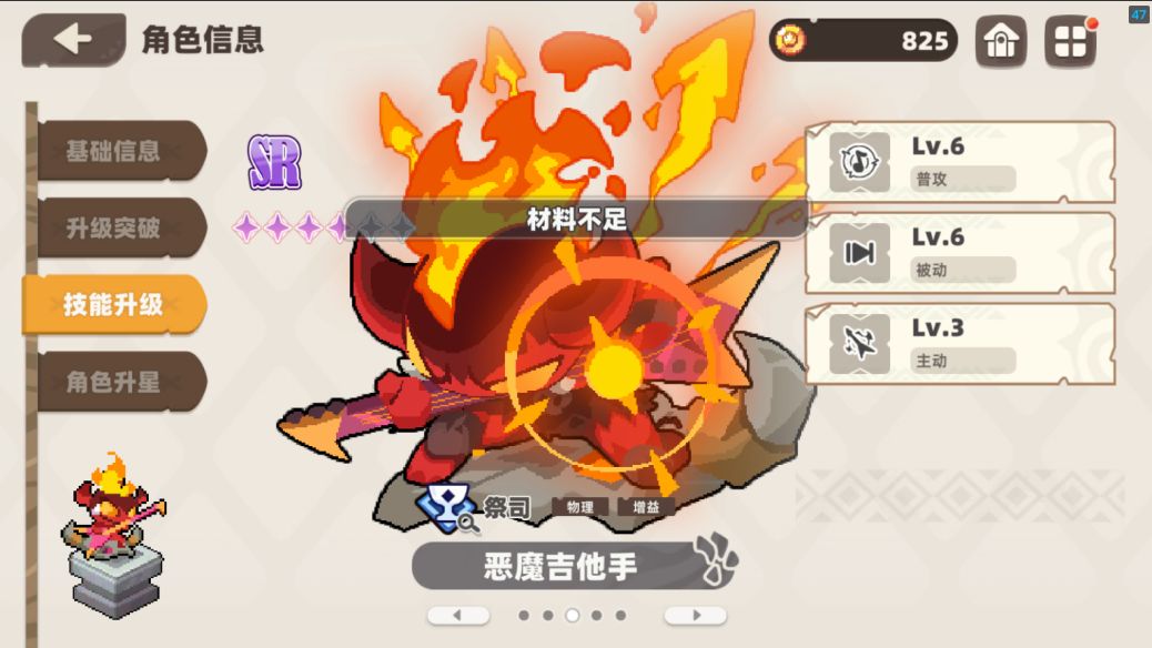 恶魔吉他手:辅助型角色,局外普攻,技能,被动点满局内322,可以降低周围角色的攻击间隔(提高攻击频率)和提高攻击力,对小莫,古辛这样的角色大大增加输出效率,对需要蓝条的角色还可以帮助他们快速恢复蓝条。