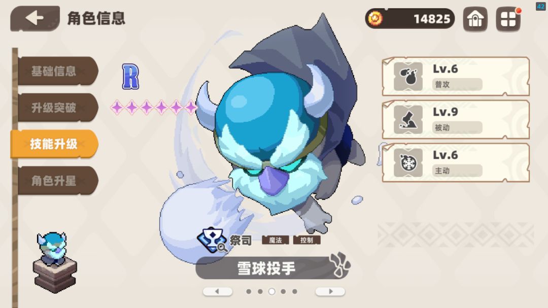 雪球投手:辅助角色,普攻可以减速敌人,LV3技能可以冰冻敌人对跑得快的敌人(说的是谁懂的都懂)可以强有力克制,局外普攻,被动,技能全部点满,局内223(普攻2被动2技能3)
