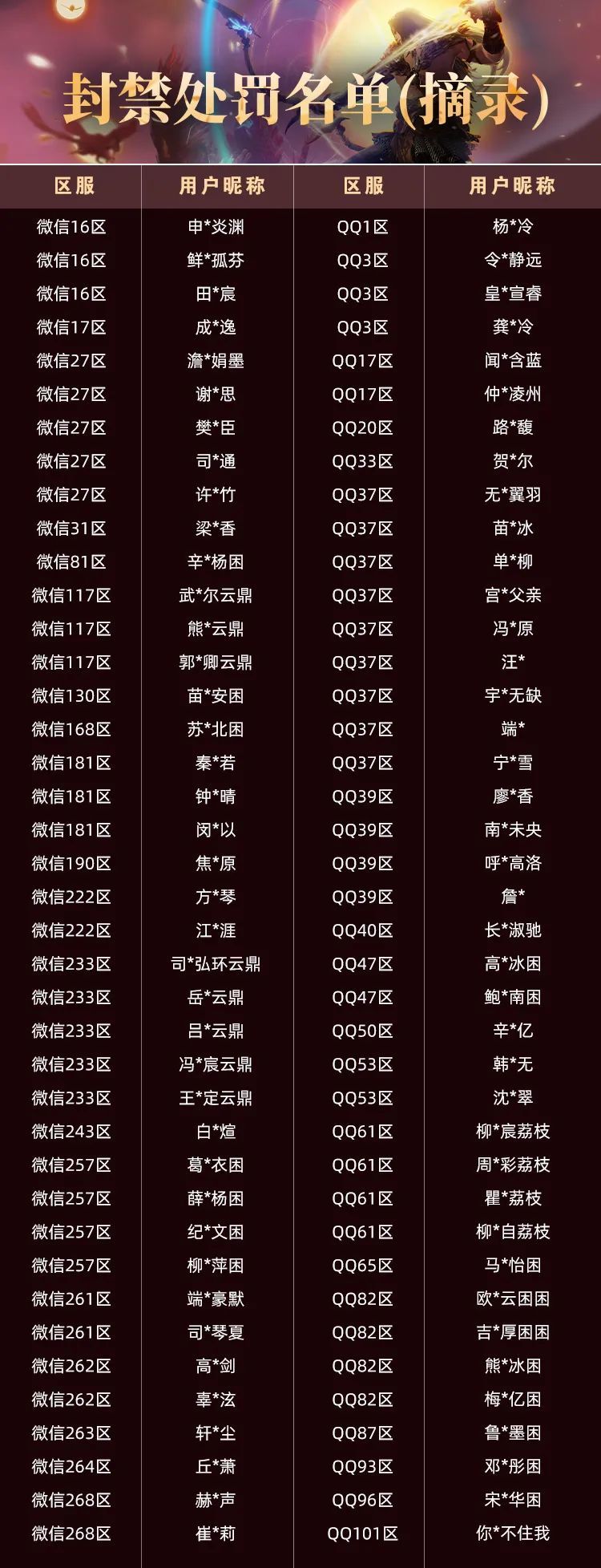 在山海管理司的不懈努力,和旅者们的支持下,违规行为呈现明显减少态势。经统计,7月全服累计封禁角色14084个,其中1205个角色被处以全区封禁十年的最高等级处罚。以下为7月经官方核实后执行十年封禁的角色信息(部分摘录):