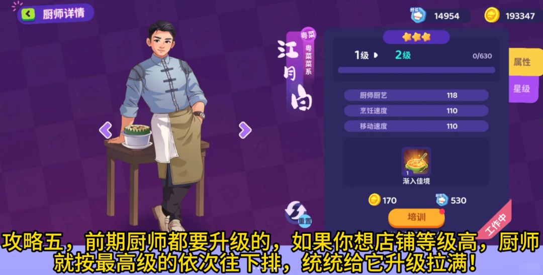 2.攻略五,前期厨师都要升级的,如果你想店铺等级高,厨师就按最高级的依次往下排,统统给它升级拉满~如图新手给的卡前期可以拉的,也是必拉的,十连爆五六个橙的欧皇也是一样的。