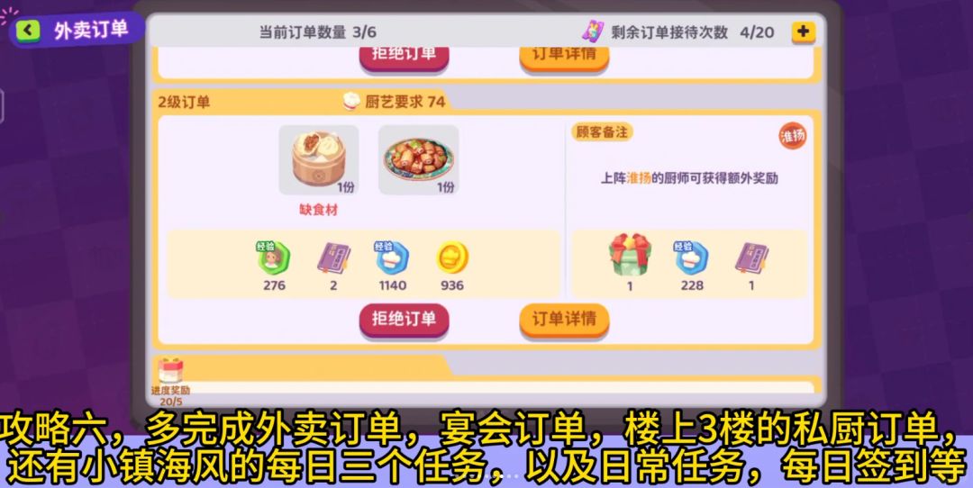 1.攻略六,多完成外卖订单,宴会订单,楼上3楼的私厨订单,还有小镇海风的每日三个任务,以及日常任务,每日签到等