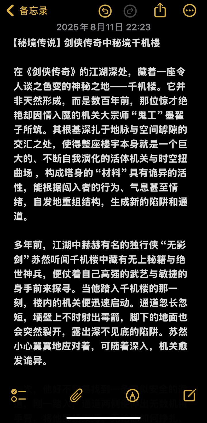 在《剑侠传奇》的江湖深处,藏着一座令人谈之色变的神秘之地——千机楼。它并非天然形成,而是数百年前,那位惊才绝艳却因情入魔的机关大宗师“鬼工”墨翟子所筑。其根基深扎于地脉与空间罅隙的交汇之处,使得整座楼宇本身就是一个巨大的、不断自我演化的活体机关与时空扭曲场 ,构成塔身的“材料”具有诡异的活性,能根据闯入者的行为、气息甚至情绪,自发地重组结构,生成新的陷阱和通道。