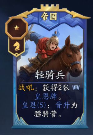金色的轻骑兵可以晋升为金的膘骑营,一张皇恩就是6数量。前期打架非常不错。