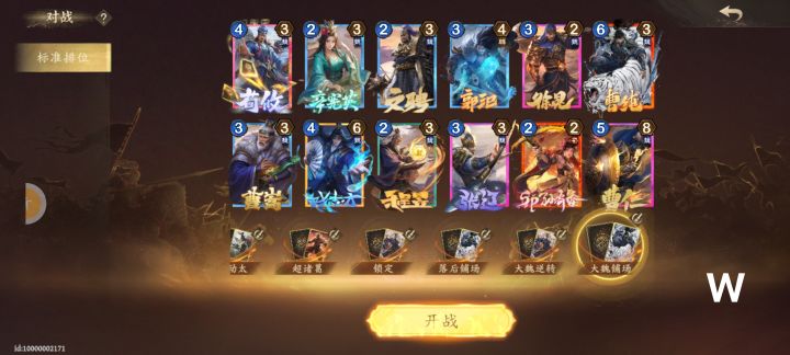 本套卡组以落后铁三角为核心,同时加入了减攻大核曹仁,以及文聘郭汜的内破坏组合。除了可以采取传统落后流打法,即二回合程昱➕双管,三回合徐晃➕程昱 ,四回合戏子复制程昱形成三路落后的局面,触发徐晃效果,进行狂暴加攻。最终在游戏结束时将胜负翻转。