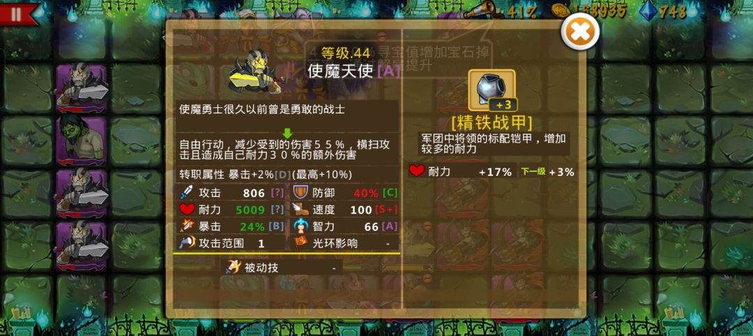 本关前几波都是两列或三列的整队,全队等级有45上下基本就可以过,不过要出手速度快一点的,会有绿鬼,打的还是很痛的,只要队伍扛得住,拿暗鬼去炸,或者拿雷电法师刷都很快,我的寻宝值比较低,但也能保持稳定2,3把出钻,新手可以拿本关先刷经验升级刷钻,过渡,BOSS有横扫攻击,拿重盾护卫抗,旁边不要放近战单位一下就扫死了,主要输出为雷电法师,还是很好过的